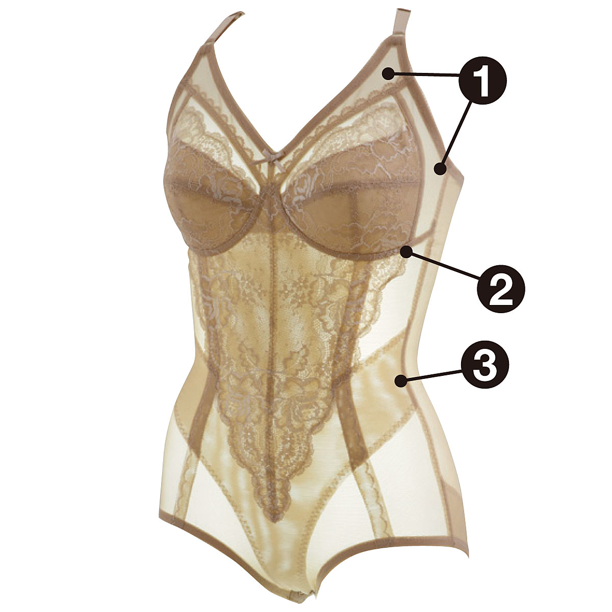 (1)額縁カップが四方から包んでバストをメイク。(2)ノンワイヤーならではの楽な着け心地。(3)裏当てでサイドからお腹すっきり。
