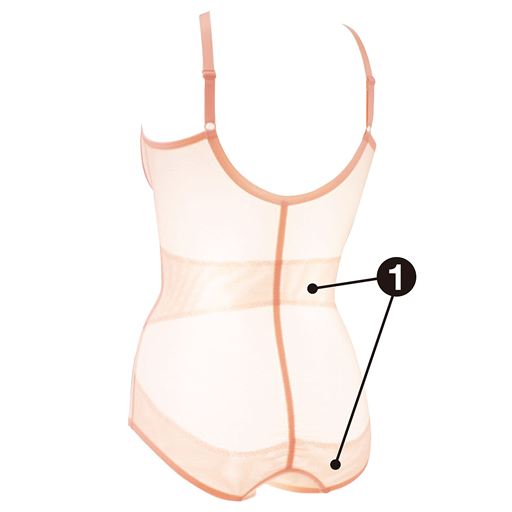 (1)ソフトワイヤー入り3枚はぎカップでバストを美しくメイク。(2)サイドからの裏当てでお腹まわりをすっきり。(3)足口は身生地折り返し仕様でくい込みにくい。