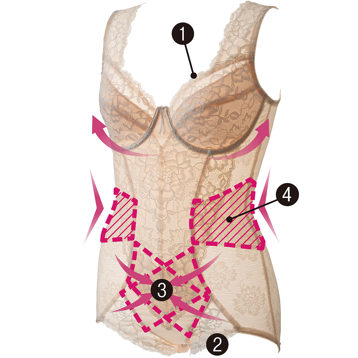 ①カップ裏上辺からお手持ちのパッドを入れられます。②前足口にはストレッチレースを使い、くい込みを軽減。③下腹にはクロスの裏当てをつけ、しっかりシェイプ。④裏当てでぐるっとウエストマークし、ほっそり引き締め。