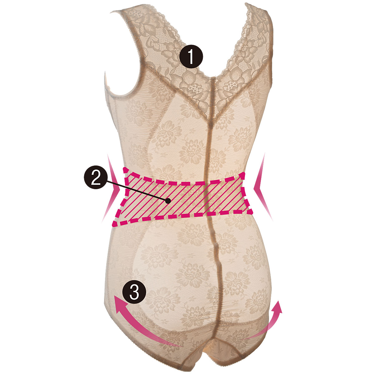 ①レース仕様で段差をつくらず、背中すっきり。②裏当てでぐるっとウエストマークし、ほっそり引き締め。③サイドから続く裏当てでボディラインすっきり、ヒップもアップ。
