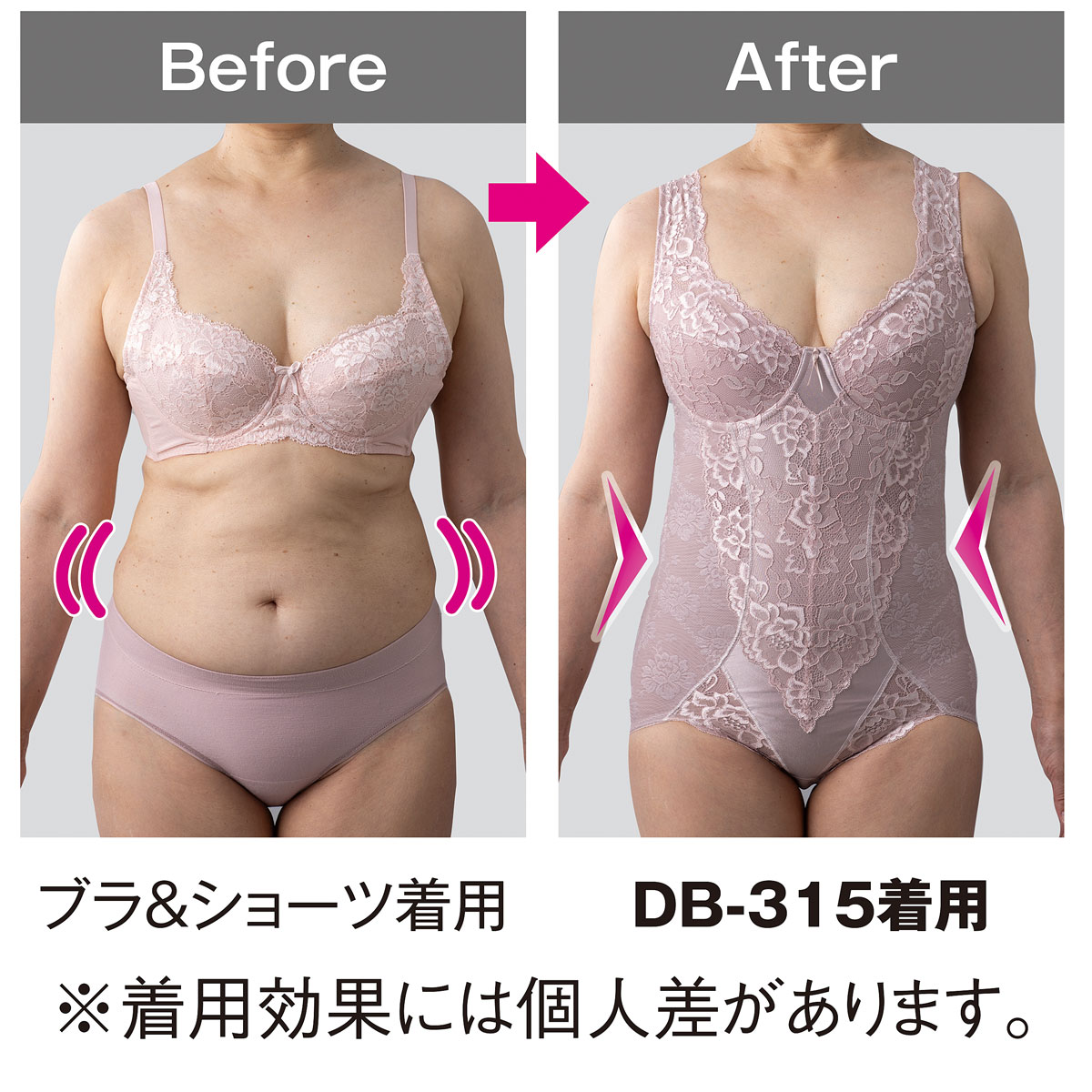 心まで満たされる美しいデザイン。ラク&キレイのプレミアムな着用感。 身生地には薄くてやわらかい新素材を採用し、さらに軽やかな着用感に仕上げました。美しい柄が映えるレースを贅沢に使い、快適な補整力と心華やぐクオリティを追求。ラクにきれいになれて、毎日着たくなるボディスーツです。(画像は同シリーズ品番DB-328です)