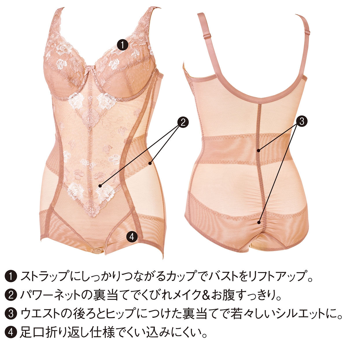 ストラップにしっかりつながるカップでバストをリフトアップ。パワーネットの裏当てでシェイプしてくびれメイク&お腹すっきり。ウエストの後ろとヒップにつけた裏当てでヒップアップし、若々しいシルエットに補整するハードタイプのボディスーツです。フロントにたっぷりあしらった刺繍レースでエレガントに装いながら、ゆるみやたるみをしっかり引き締めてやせ見えを叶えます。足口は折り返し仕様でくい込みにくく、着心地のよさにもこだわりました。