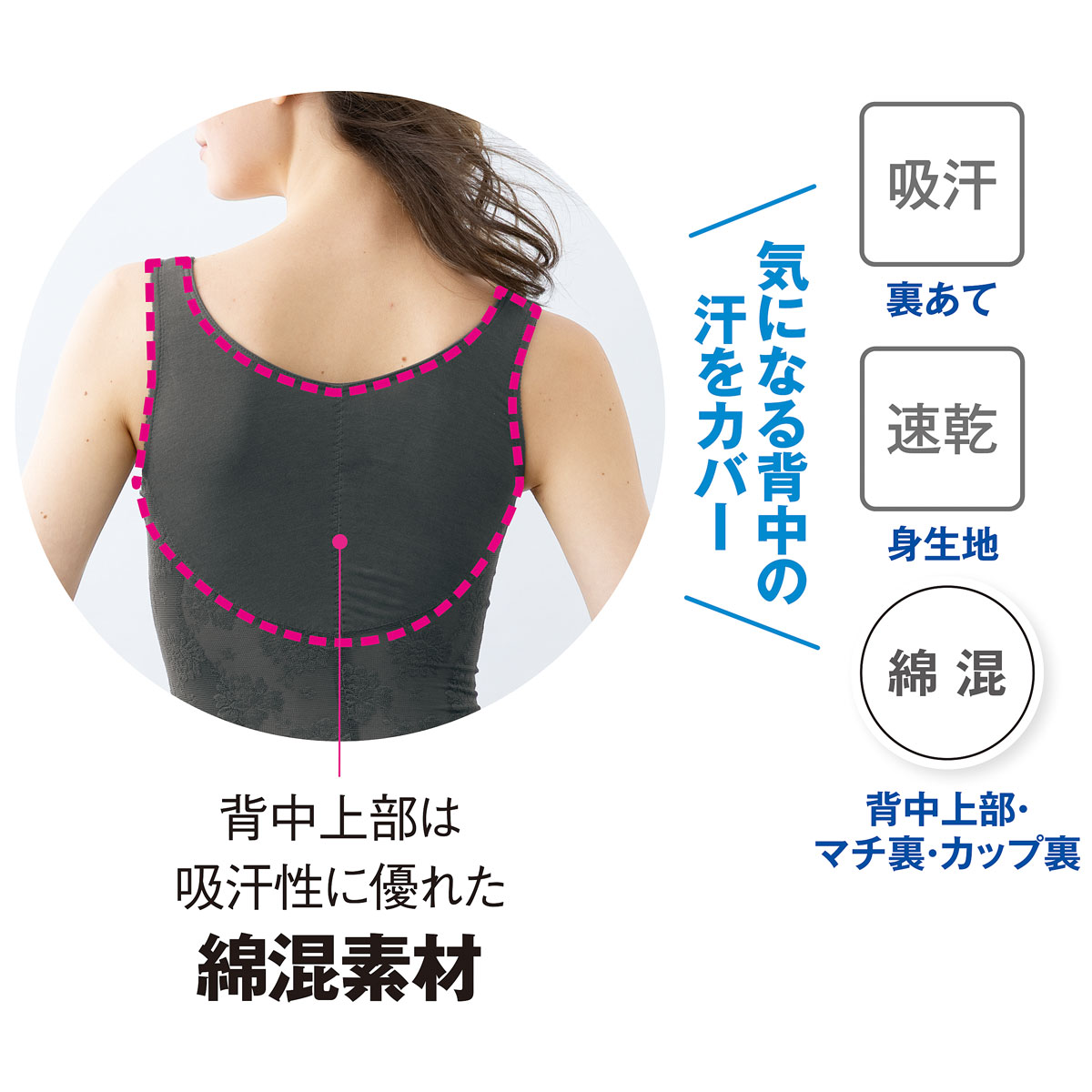 吸汗・速乾機能の素材+ストラップと背中上部は綿混素材を使用。ストラップは見えても下着と気づかれにくく、綿混素材だから肌あたりもやさしく、くい込みにくい。