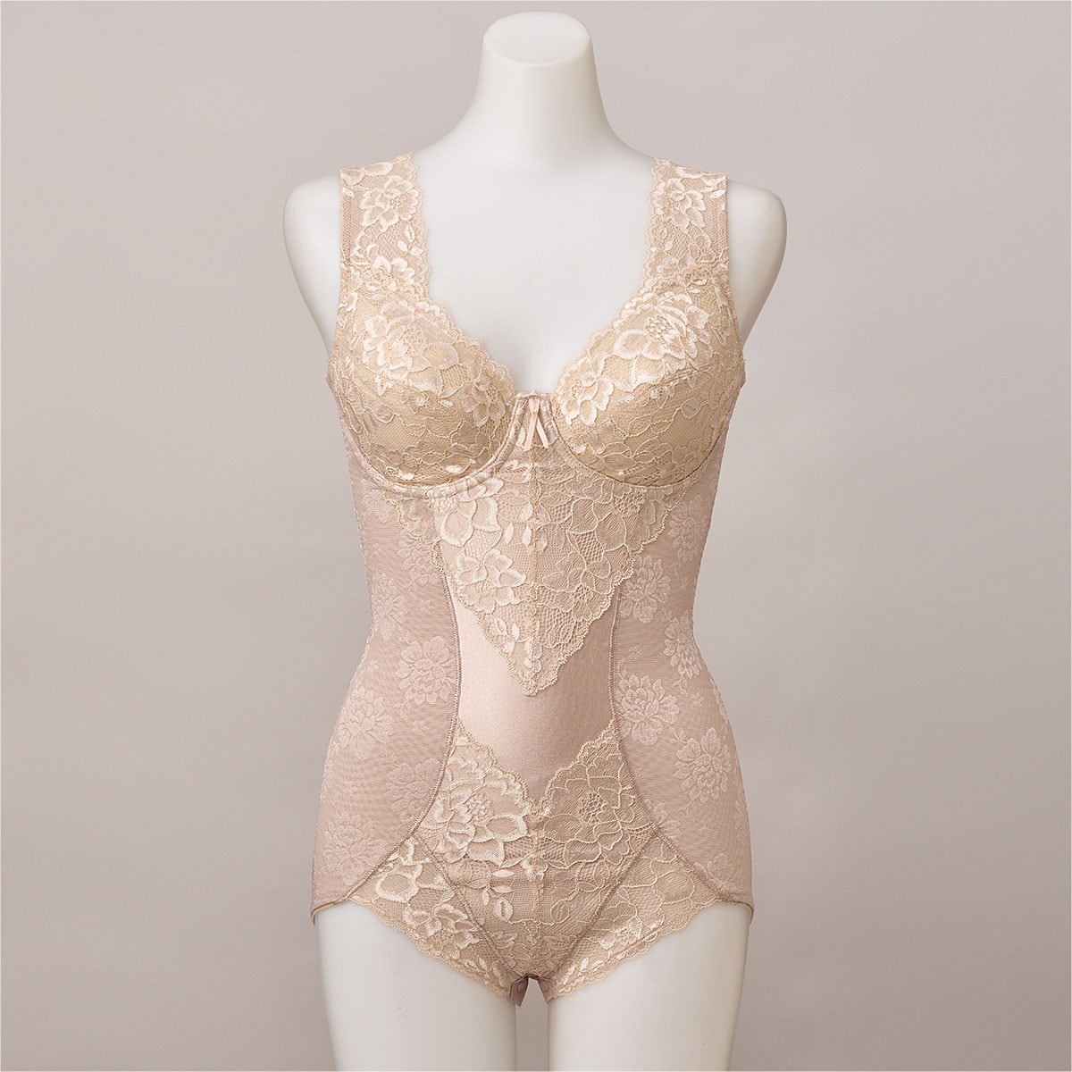 心まで満たされる美しいデザイン。ラク&キレイのプレミアムな着用感。 身生地には薄くてやわらかい新素材を採用し、さらに軽やかな着用感に仕上げました。美しい柄が映えるレースを贅沢に使い、快適な補整力と心華やぐクオリティを追求。ラクにきれいになれて、毎日着たくなるボディスーツです。