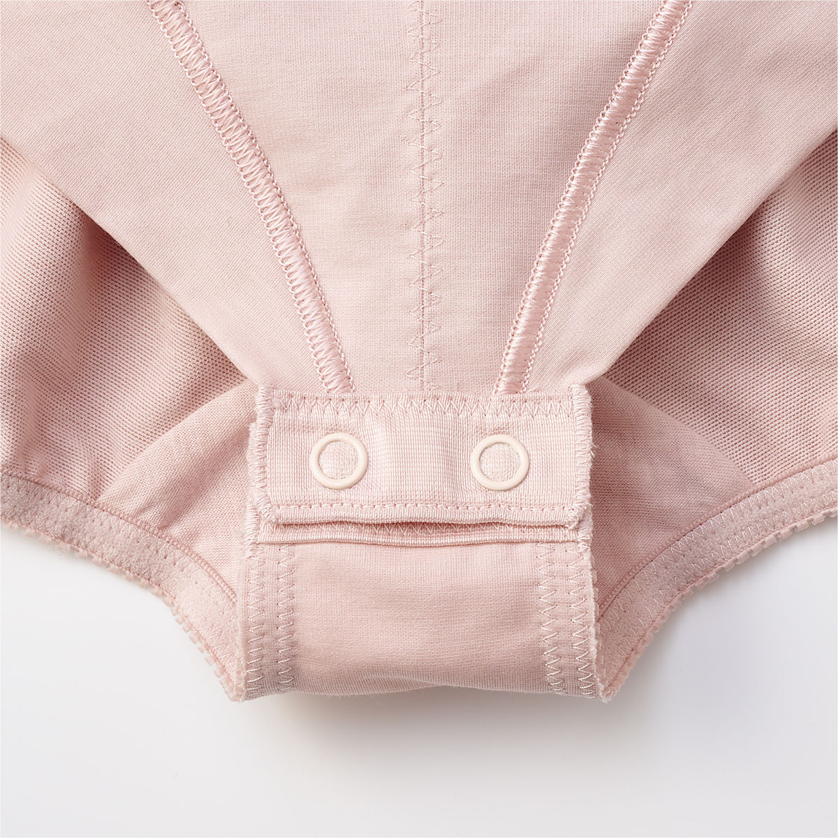 前ファスナー仕様で着脱がラク。肌側に当て布付きでファスナーが肌に当たらず、お肉の巻き込みも防止します。