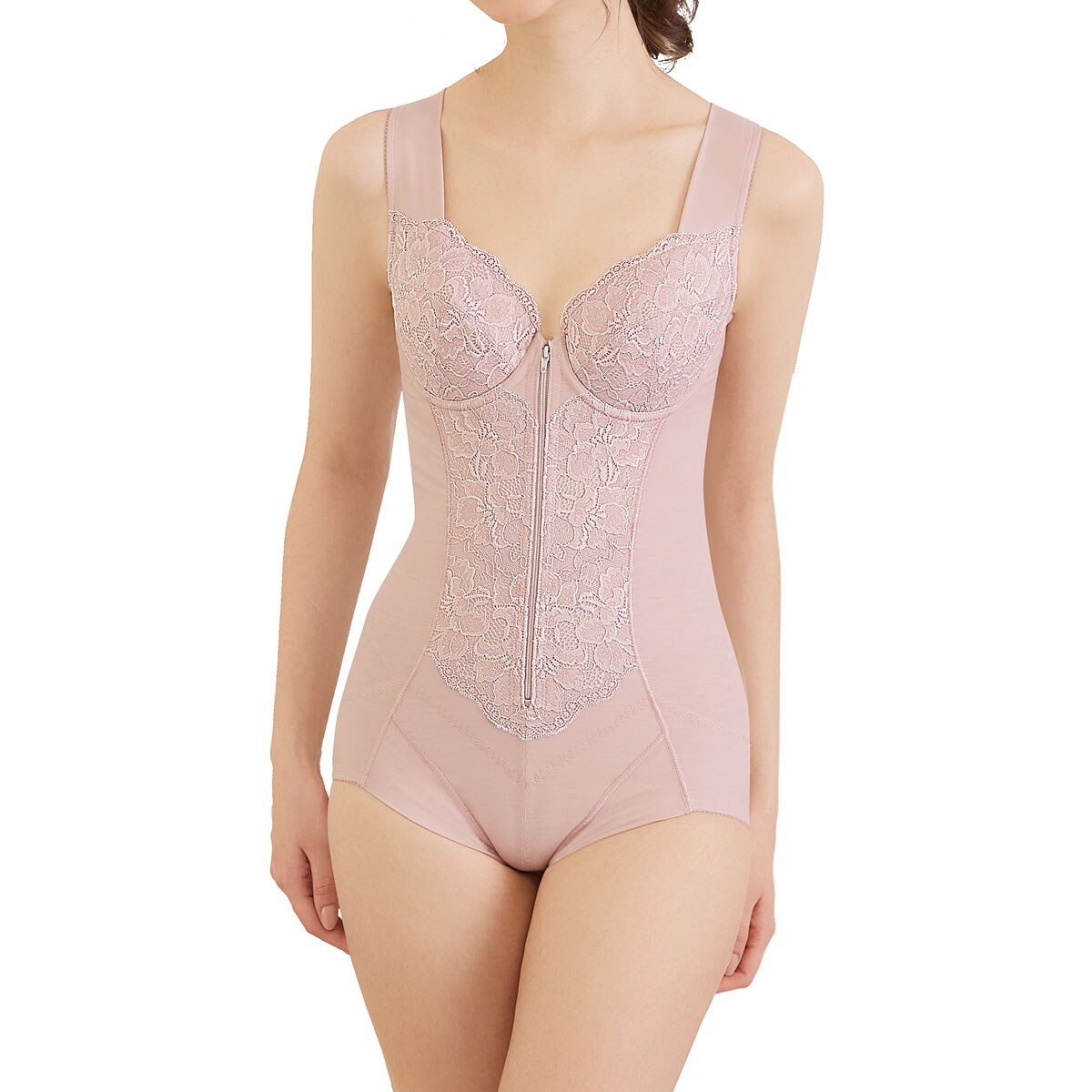 身生地も裏当ても綿混素材を使用したボディスーツです。V字型の特殊パネルで気になるお腹をおさえてすっきりメイク。フロントはファスナー付きで着脱簡単、幅広タイプのストラップで肩にくい込みにくくラクな着用感です。