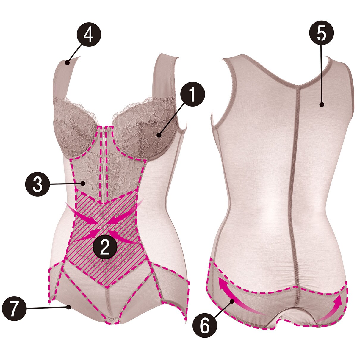 (1)ソフトワイヤー入りカップで上向きバストに。(2)V字型パネルでお腹をシェイプ。(3)綿混パワーネットの裏当てで引き締め感アップ。(4)幅広ストラップで肩がラ(5)身生地は綿混サテンネットで程よく補整。(6)綿混パワーネットの裏当てでヒップを上向きに。(7)足口は折り返し仕様で圧迫感を軽減。