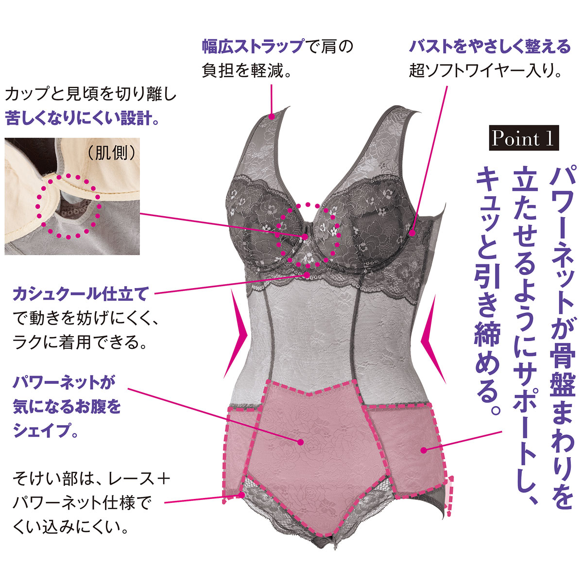 【Point 1】パワーネットが骨盤まわりを立たせるようにサポートし、キュッと引き締める。●幅広ストラップで肩の負担を軽減。●バストをやさしく整える超ソフトワイヤー入り。●カップと見頃を切り離し苦しくなりにくい設計。●カシュクール仕立てで動きを妨げにくく、ラクに着用できる。●パワーネットが気になるお腹をシェイプ。●そけい部は、レース+パワーネット仕様でくい込みにくい。