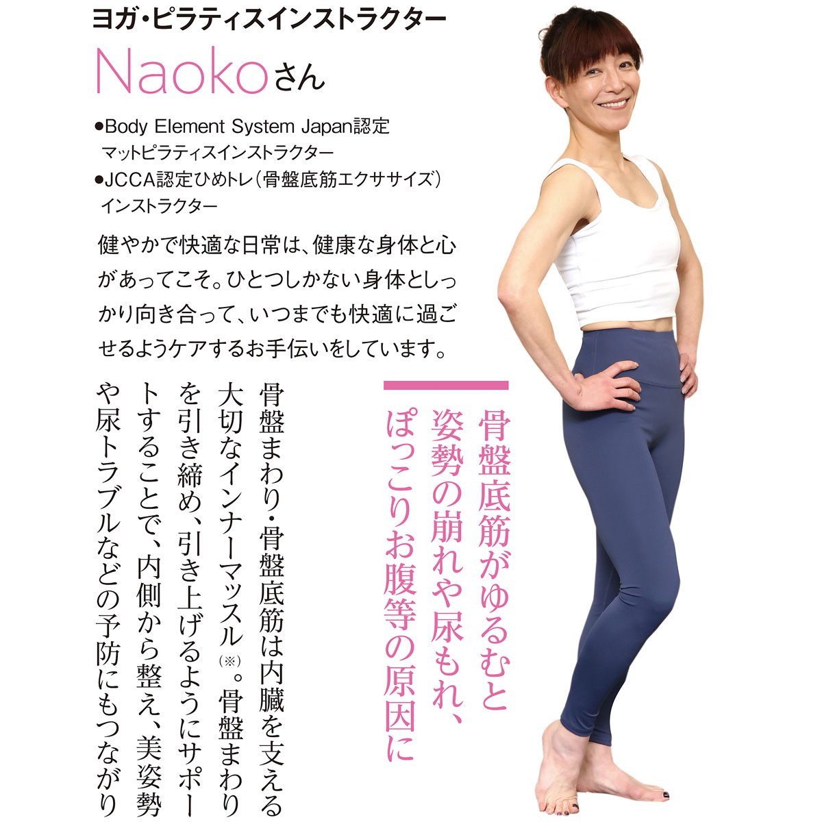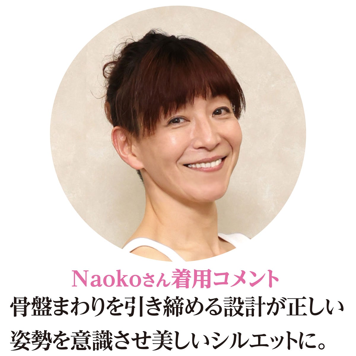 Naokoさん着用コメント「骨盤まわりを引き締める設計が正しい姿勢を意識させ美しいシルエットに。」※着用効果には個人差があります。※着用感のコメントは個人的な感想です。