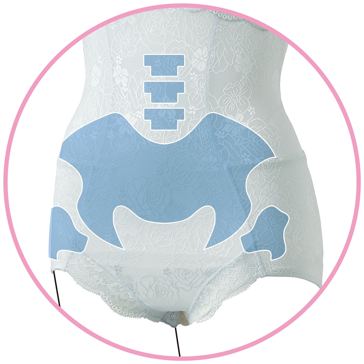 着用することで骨盤まわりを引き締める設計が、正しい姿勢を意識させ美しいシルエットに。背中上部のパワーネットで背筋を整え、お腹から骨盤まわりに配したパワーネットが、気になるお腹をおさえながら骨盤まわりを立たせるようにサポートし、キュッと引き締めます。老け見えを防ぎ、いつまでも美しく・若々しく!