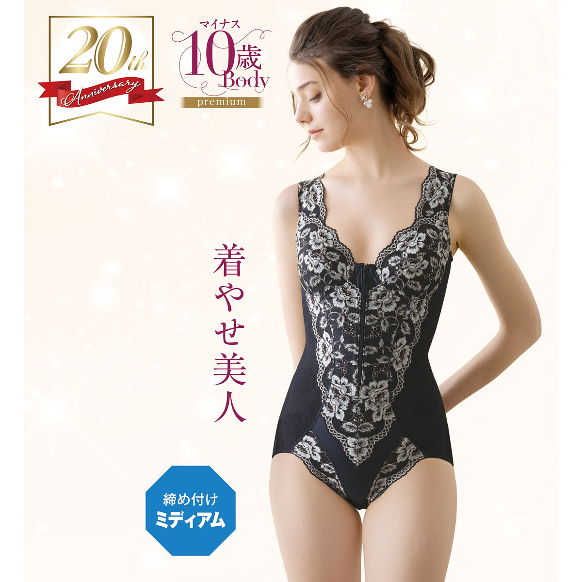 目指せ、マイナス10歳ボディ!リニューアルした「着やせ美人」のボディスーツ。20周年記念モデルとしてブラック登場。軽やかな着心地でデザインも華やかに