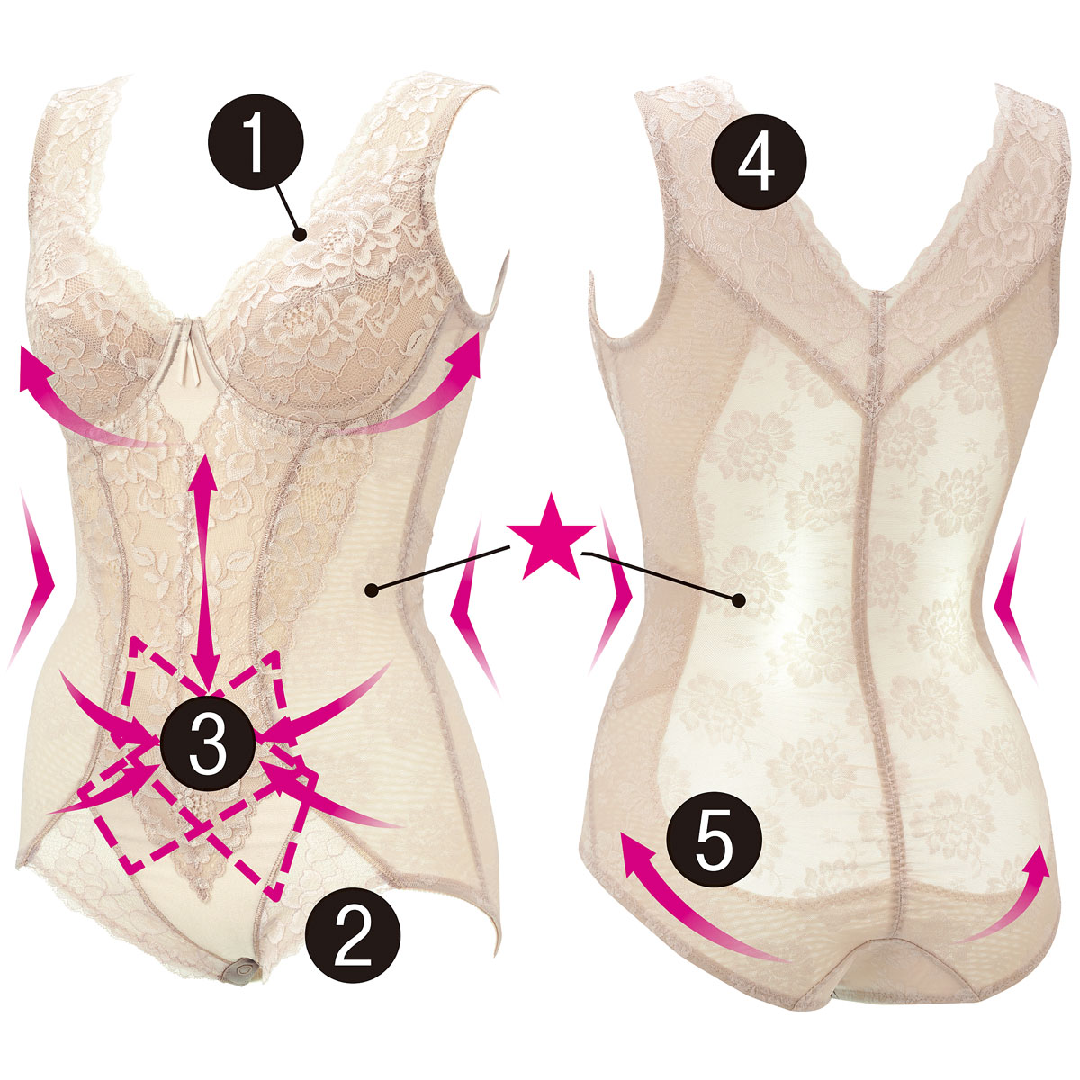 (1)カップ裏上辺からお手持ちのパッドを入れられます。超ソフトワイヤー入りで楽にバストメイク。(2)前足口にはストレッチレースを使い、くい込みを軽減。(3)下腹にはクロスの裏当てをつけ、しっかりシェイプ。(4)レース仕様で段差をつくらず、背中すっきり。(5)サイドから続く裏当てでボディラインすっきり、ヒップもアップ。写真はDB-309シェルピンクですが補整機能は同じです。