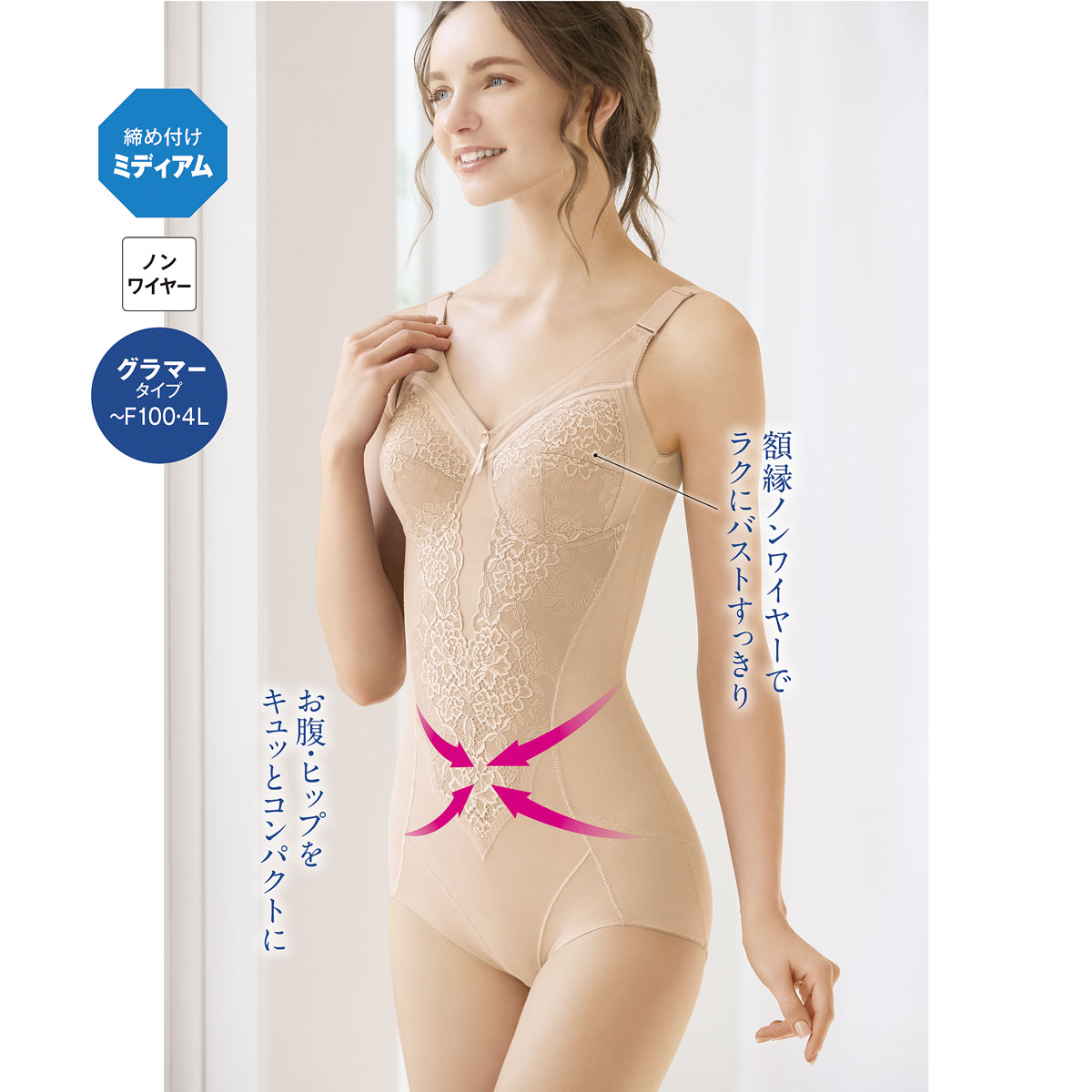 グラマーボディをコンパクトに見せる夏素材のボディスーツ。すぐれた伸縮性と補整効果、吸汗速乾性を備えたパワーネットを使用。さらっと気持ちいい肌ざわりで、ボディラインをメイクします。V字の縮小パターンパワーネットの裏当てがしっかりおさえてお腹すっきり。バストは四方から包み込み、ノンワイヤーでもしっかりホールド。ヒップは大きめの裏当てでカバーし、ボリュームをおさえながらシルエットをメイク。背中上辺と足口はテープを使わずくい込みにくい身生地折り返し仕様。大きいサイズ(F100・4L)まで展開。