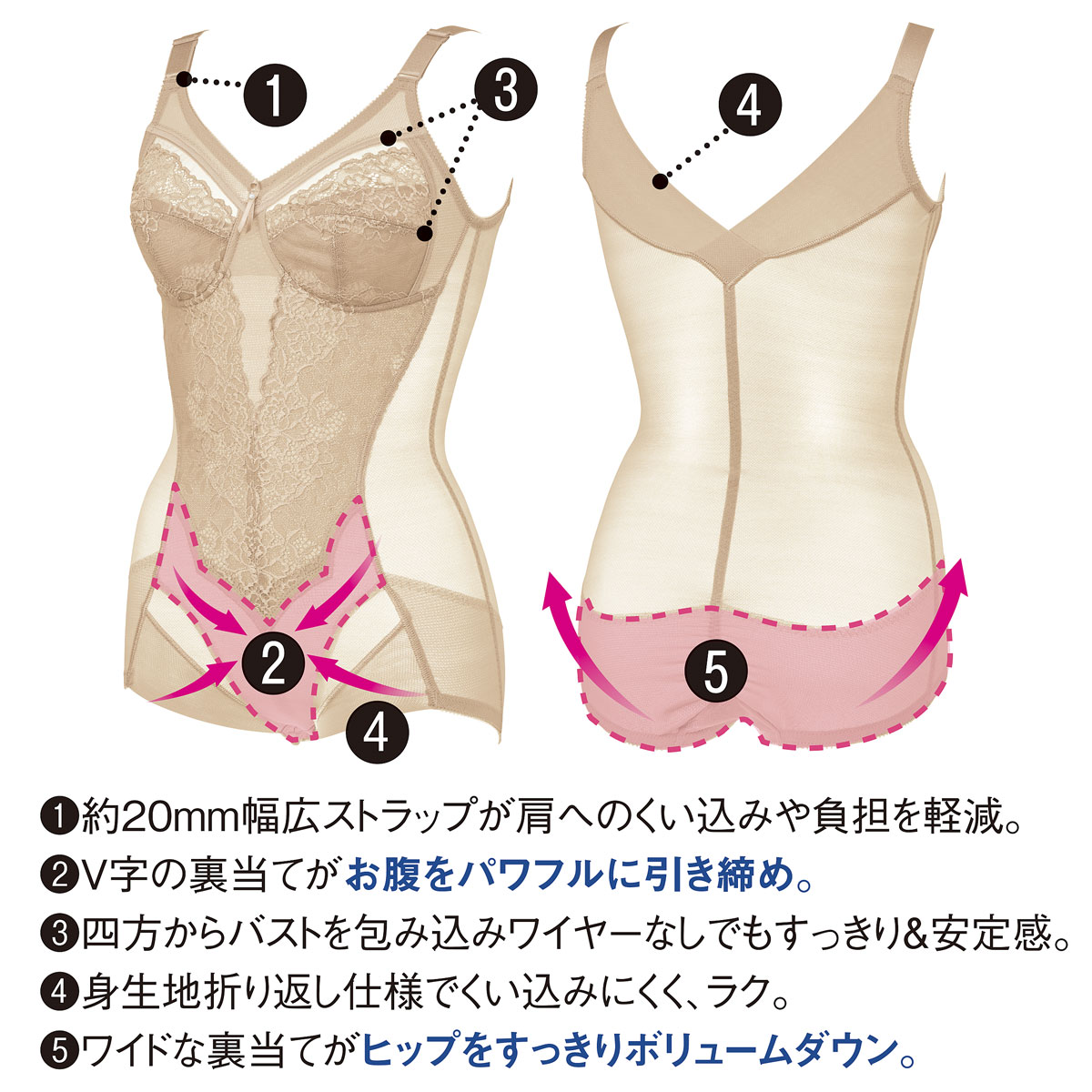 (1)約20mm幅広ストラップが肩へのくい込みや負担を軽減。(2)V字の裏当てがお腹をパワフルに引き締め。(3)四方からバストを包み込みワイヤーなしでもすっきり&安定感。(4)身生地折り返し仕様でくい込みにくく、ラク。(5)ワイドな裏当てがヒップをすっきりボリュームダウン。