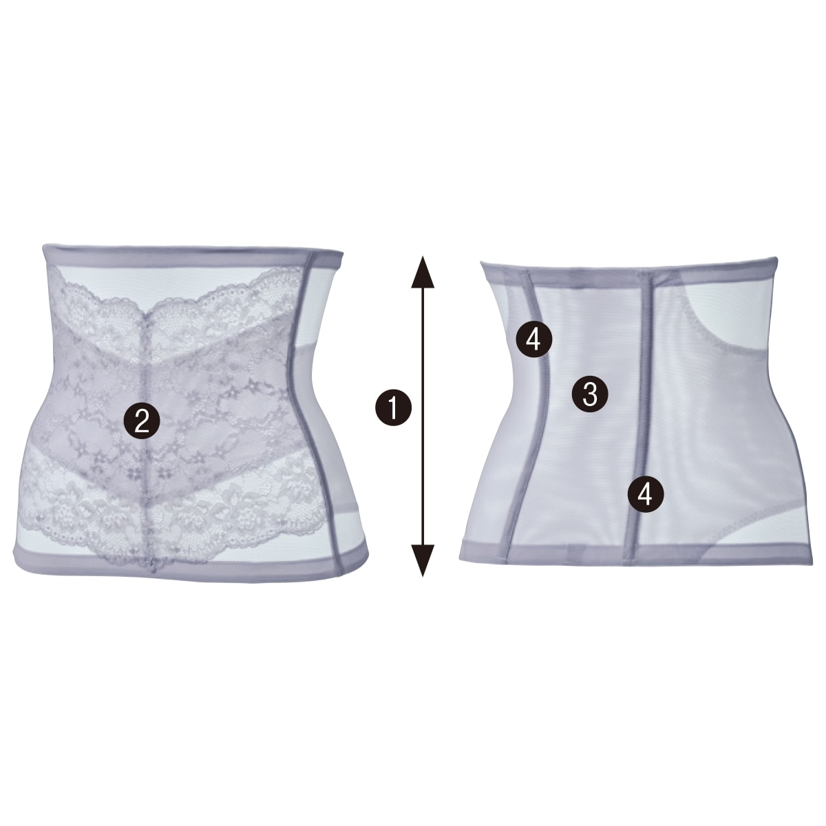 (1)アンダーからウエストまですっぽりカバー。(2)裏当て付きでお腹をおさえる。(3)2重のパワーネットでくびれをメイク。(4)2本のボーンでしっかり支え、めくれを軽減。