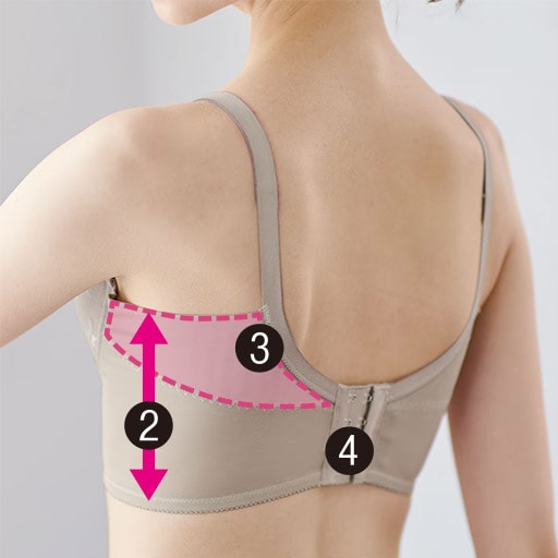 グレージュ (1)カップ先のレースパネルが面でバストを引き上げ。(2)超脇高設計だから脇接ぎ&ボーンなしでもラクに整える。 脇スッキリ
