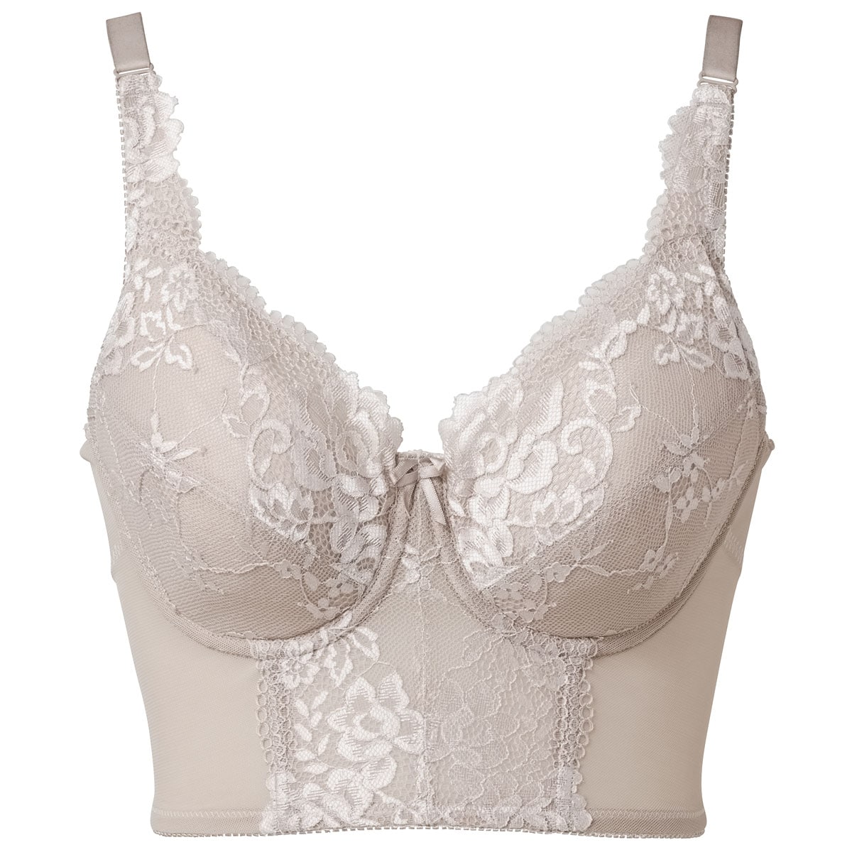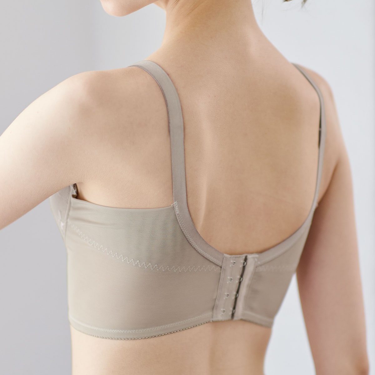 グレージュ (1)カップ先のレースパネルが面でバストを引き上げ。(2)超脇高設計だから脇接ぎ&ボーンなしでもラクに整える。 脇スッキリ