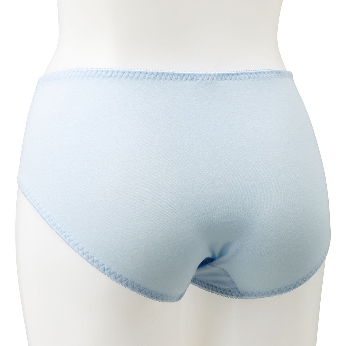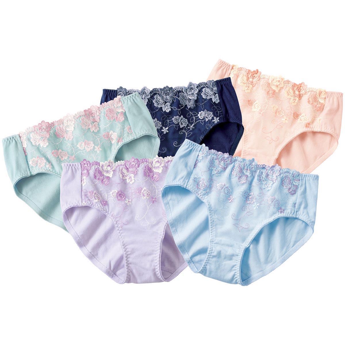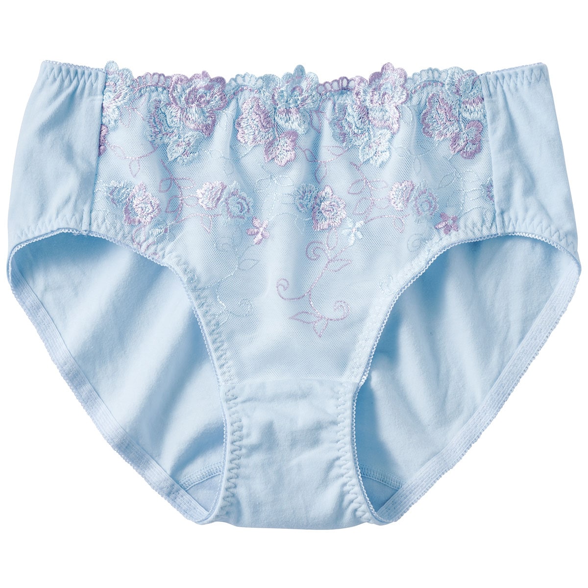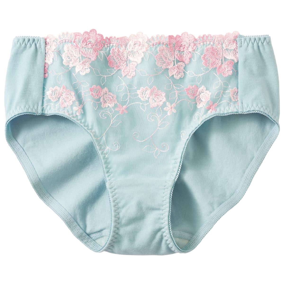 フロントの刺繍レースが華やかで気分も上がる♪身生地は綿たっぷり95%混のストレッチ素材だから肌にやさしくぴったりフィット。インクブルー・スィートブルー・スカロップシェルの3色は、ブラ(品番BA-748)とセットアップ風に着用いただけます。