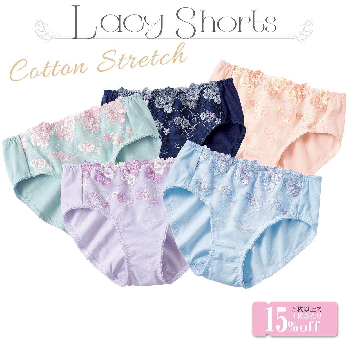 綿95%ストレッチ素材が心地いい、刺繍レースショーツ