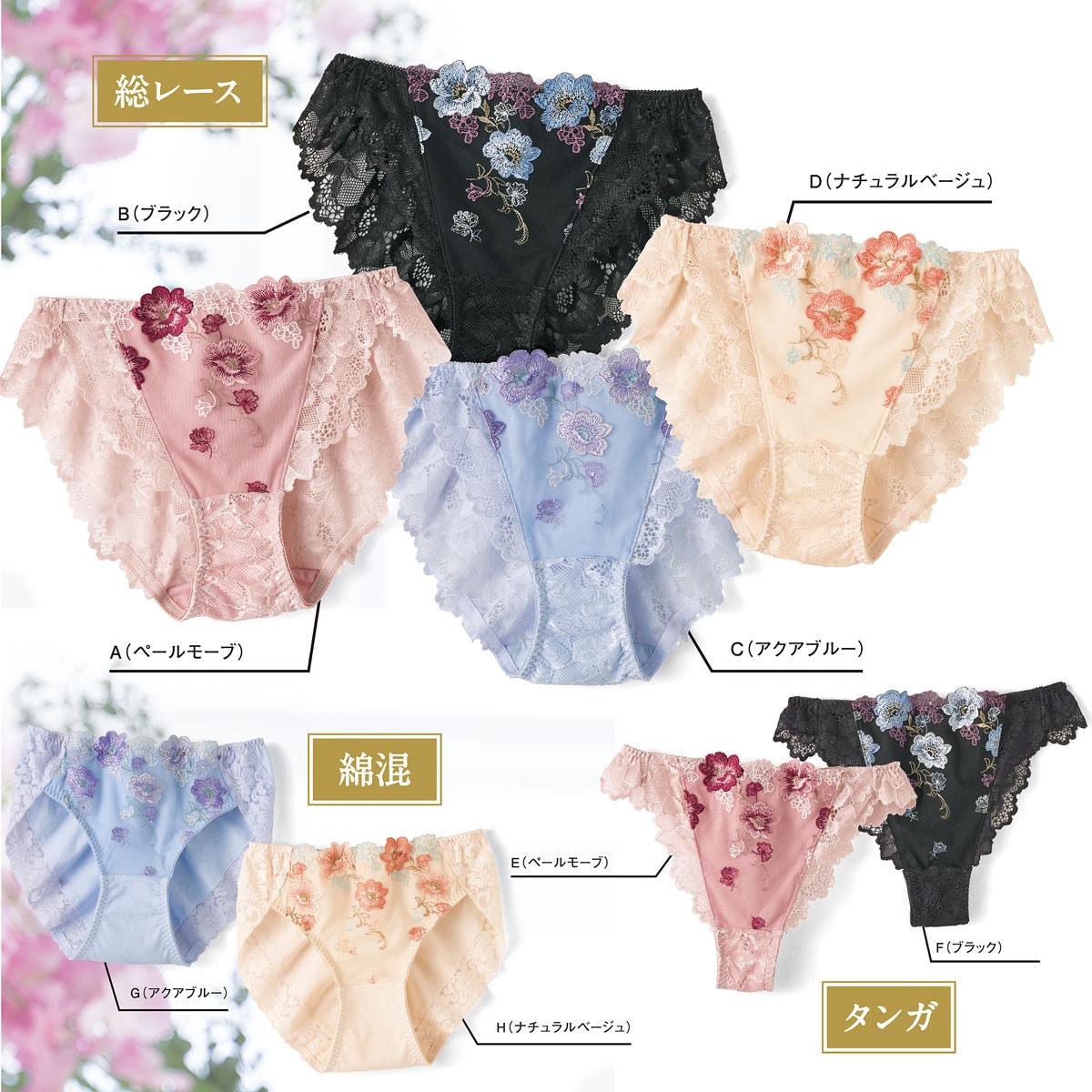 大人がときめく可愛さと色気をちりばめた、刺繍レースのデザインショーツ。贅沢なレース使いの総レースタイプ(A・B・C・D)、軽やかな履き心地のタンガ(E・F)、綿混身生地の安心な履き心地、綿混タイプ(G・H)ついつい目移りしそうなラインナップです。大きいサイズ(5L)まで展開。