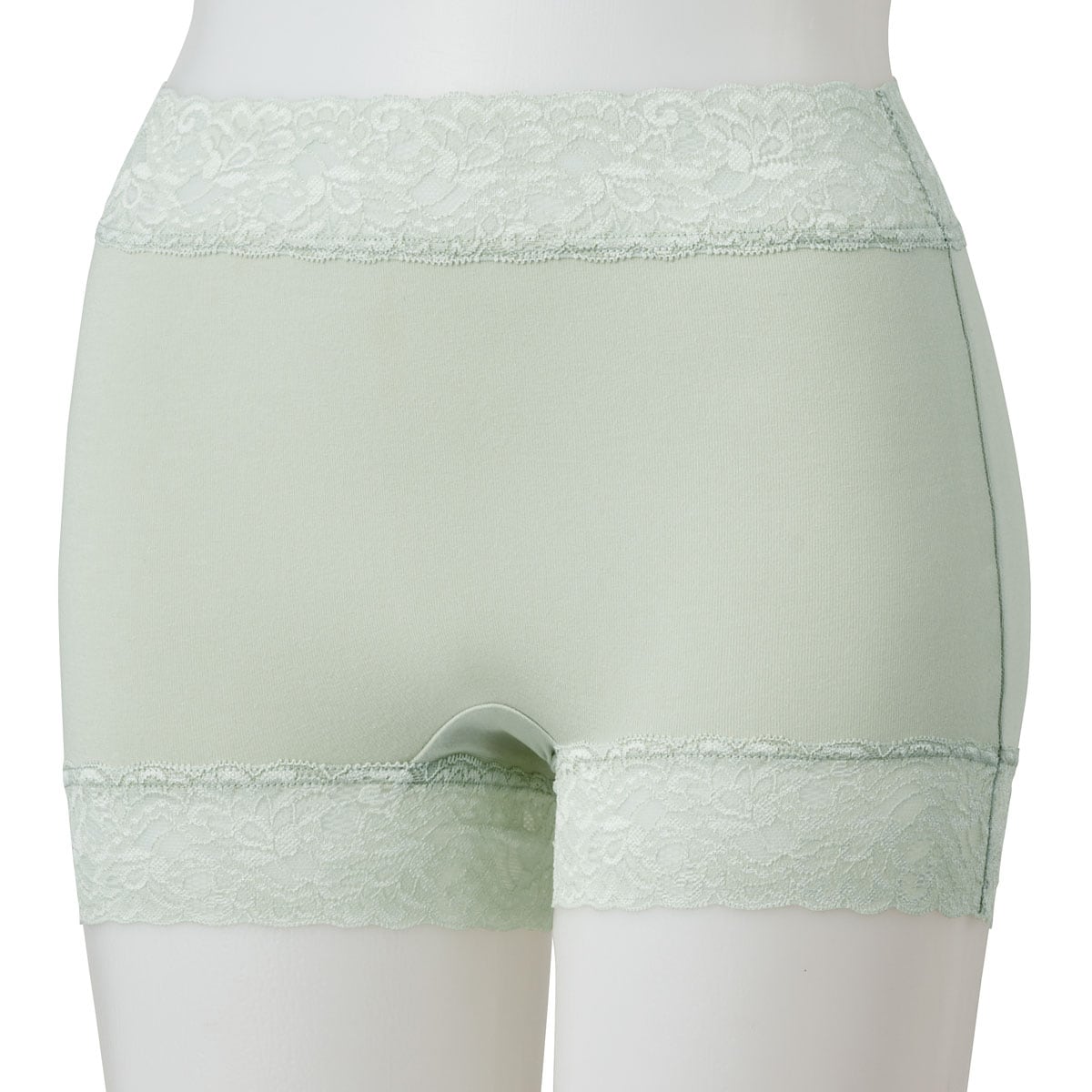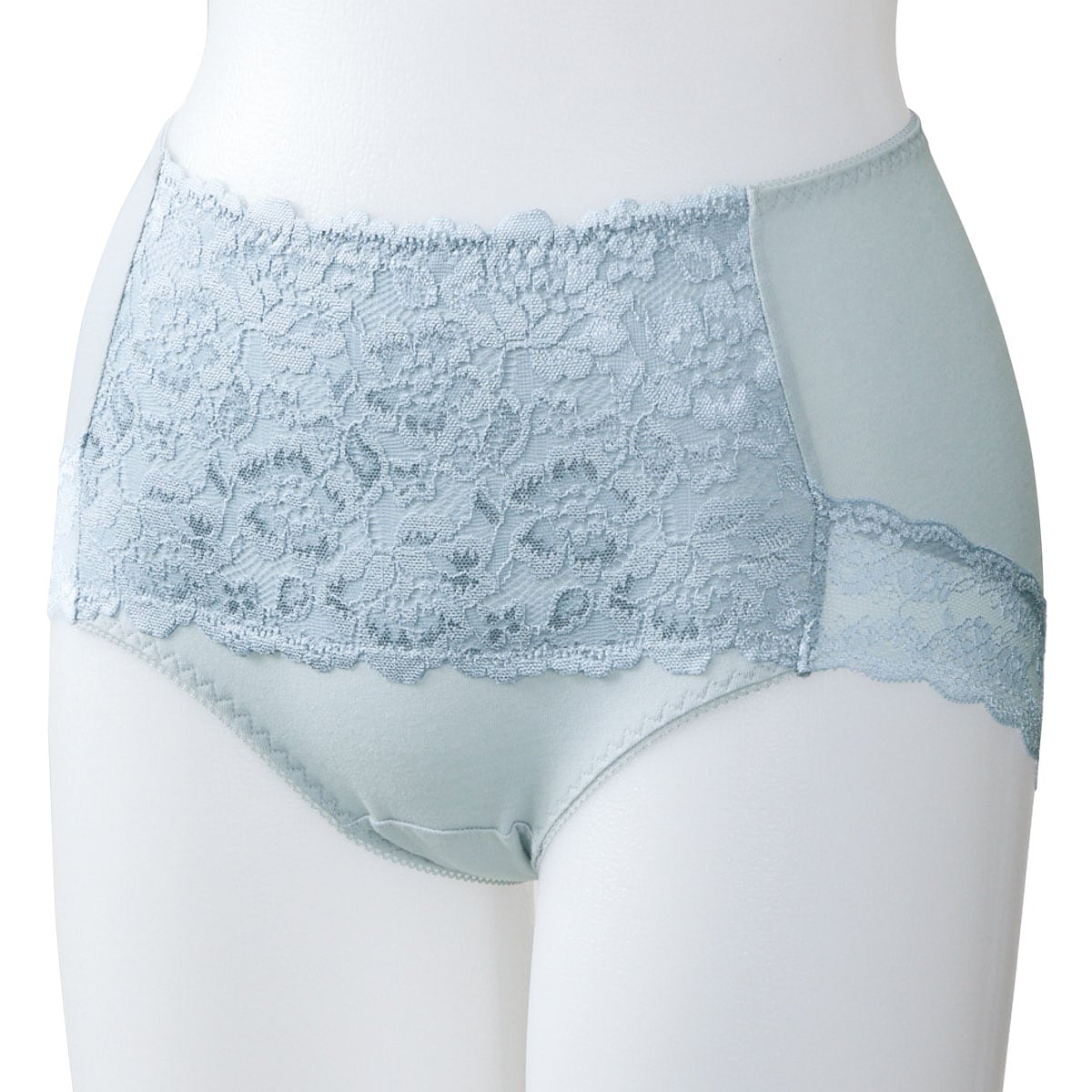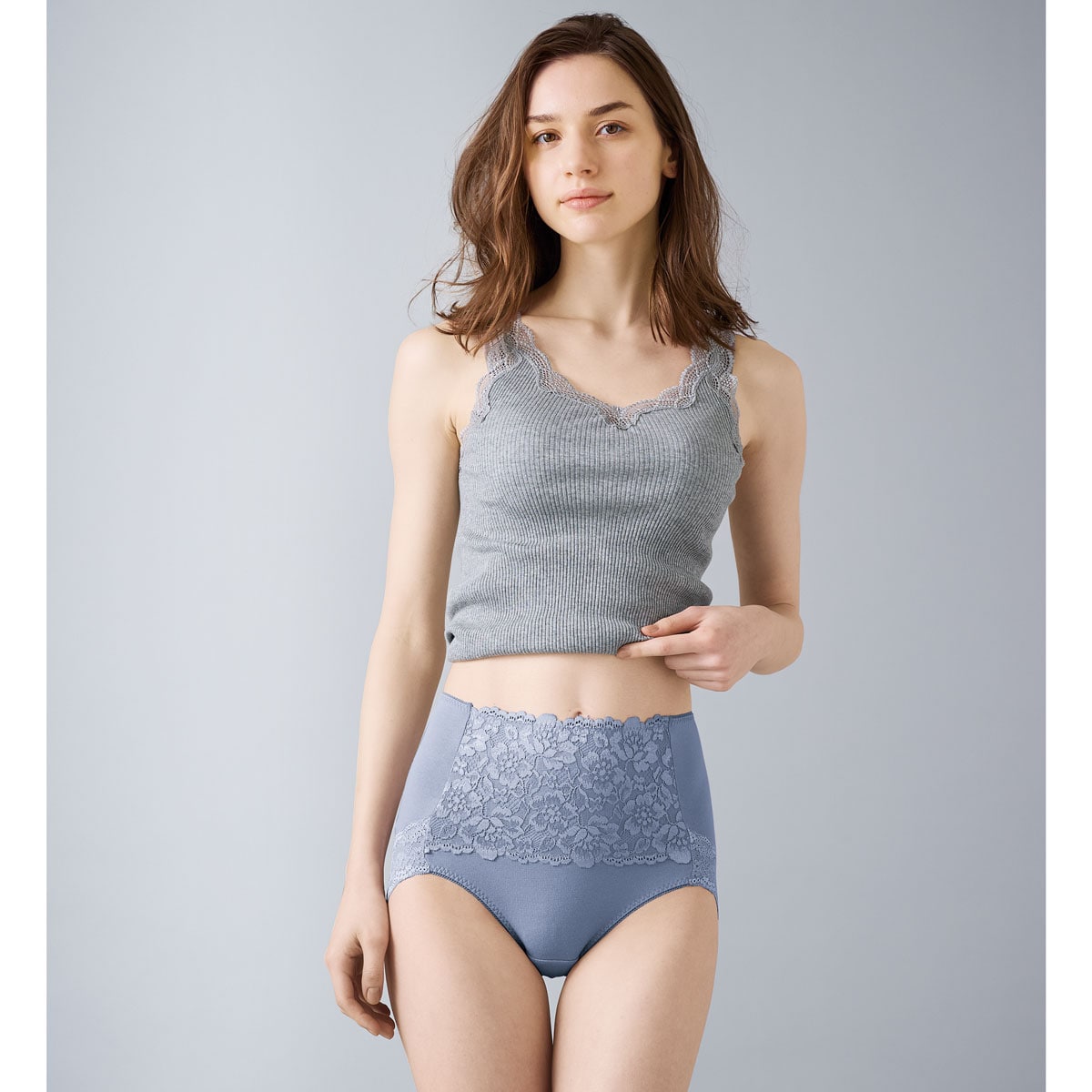 身生地は綿混率95%のストレッチ天竺素材で、肌当たりもフィット感も優秀。安心感のあるはきこみ丈スタンダードタイプのショーツを、レースたっぷりのエレガントな表情に仕上げました。