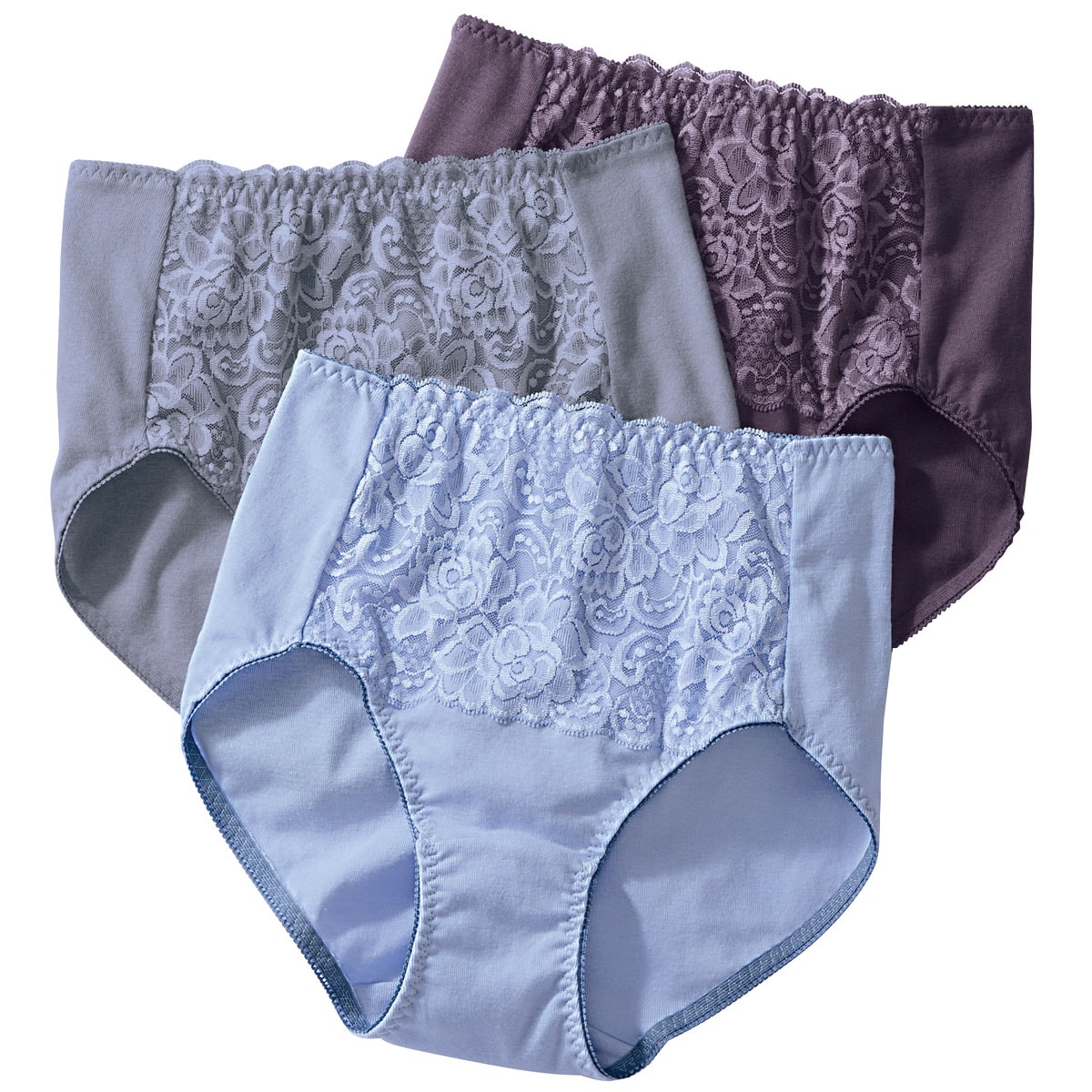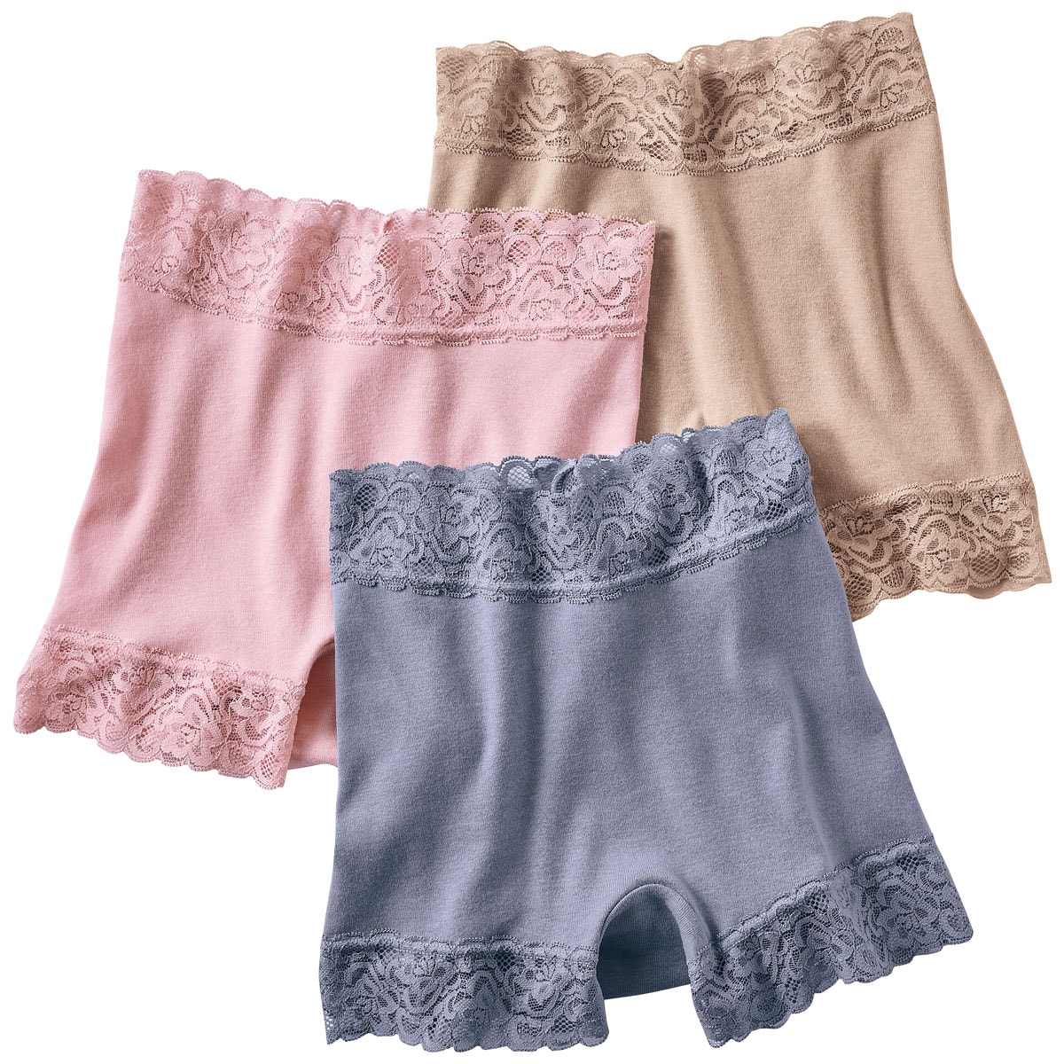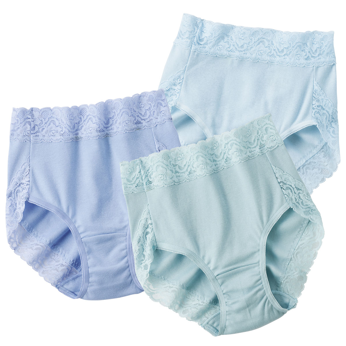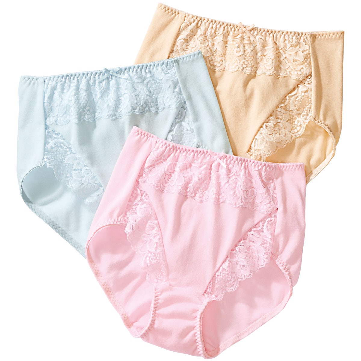肌当たりやさしい綿100%素材。レースたっぷりエレガントなスタンダードショーツをデイリー使いにうれしい色違い3枚組で。