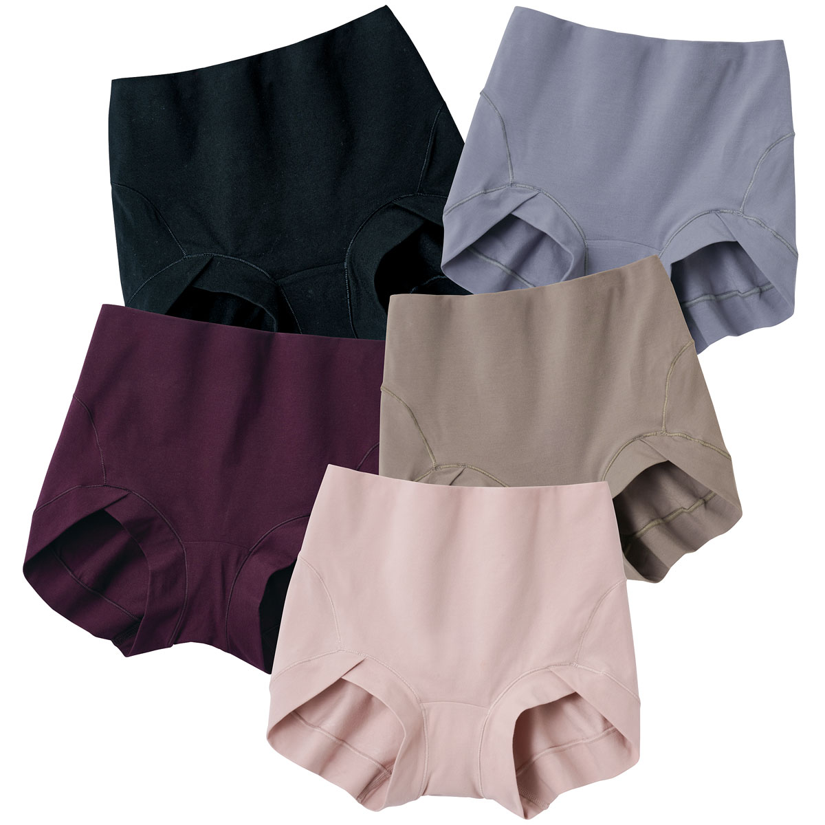 (1)フロントは生地2重、下腹は3重仕立て(2)レース・ゴムもなく不快なくい込みも軽減(3)お腹もヒップもすっぽり包み込む(4)フィット感の高いハイパワー天竺。肌にやさしい綿80%