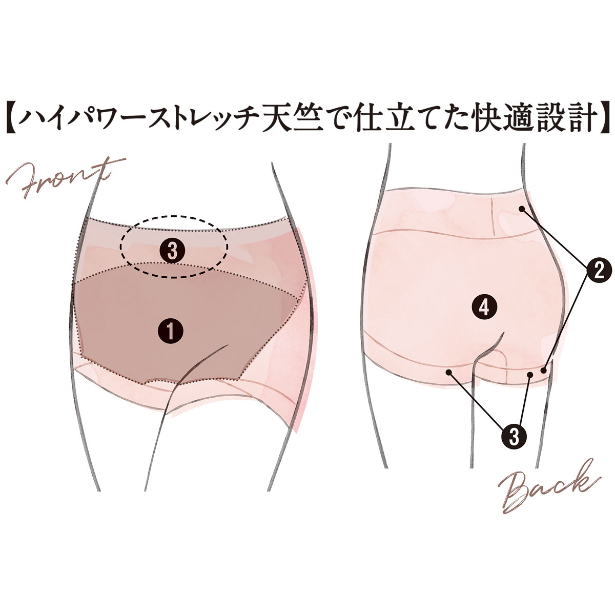 Front (1)フロントは生地2重下腹は3重仕立て 気になる下腹部分はタテヨコの伸びをおさえ、広い面でカバーしたお腹を、幅広ベルトで支える。(2)レースもゴムもない不快なくい込みを軽減(3)お腹もヒップもすっぽり包み込む はき込みは深め