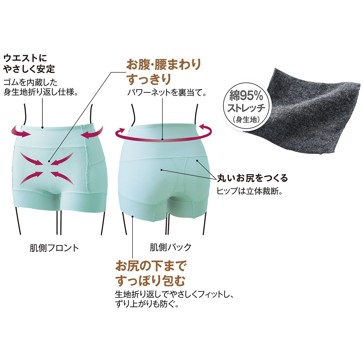 肌側バック (1)お腹・腰まわりすっきり パワーネットを裏当て。(2)丸いお尻をつくるヒップは立体裁断。(3)お尻の下まですっぽり包む 生地折り返しでやさしくフィットし、ずり上がりも防ぐ。
