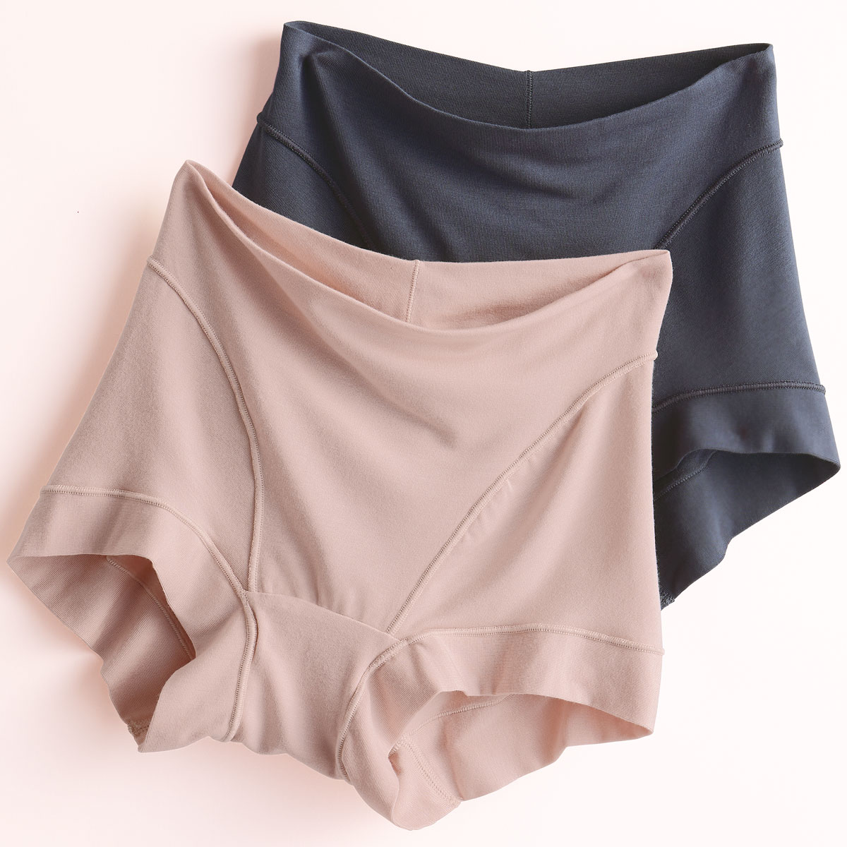 (上から)コスミックグレー、パウダーピンクくいこみにくい。ゴムを使わず生地折り返しの仕様。生地の伸びだけでおなかや足まわりにやさしく寄り添うフィット感。