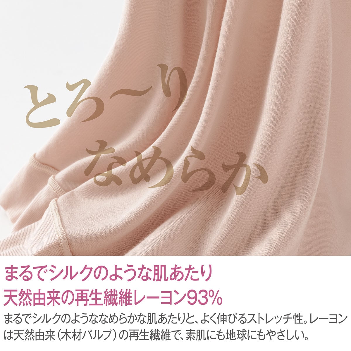 天然由来の再生繊維。まるでシルクのような肌当たり。レーヨンたっぷり93%ストレッチ素材 なめらかタッチのとろみ感触が心地いい。