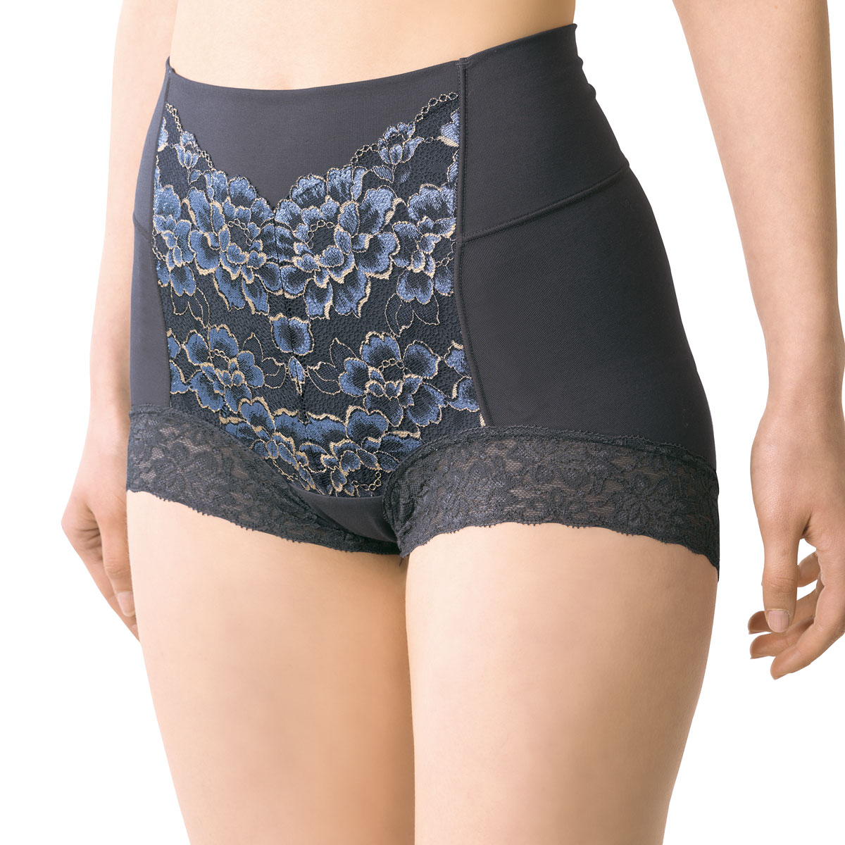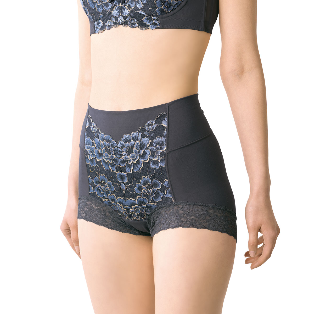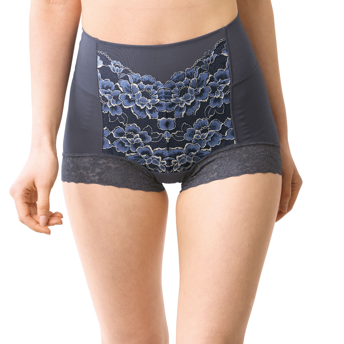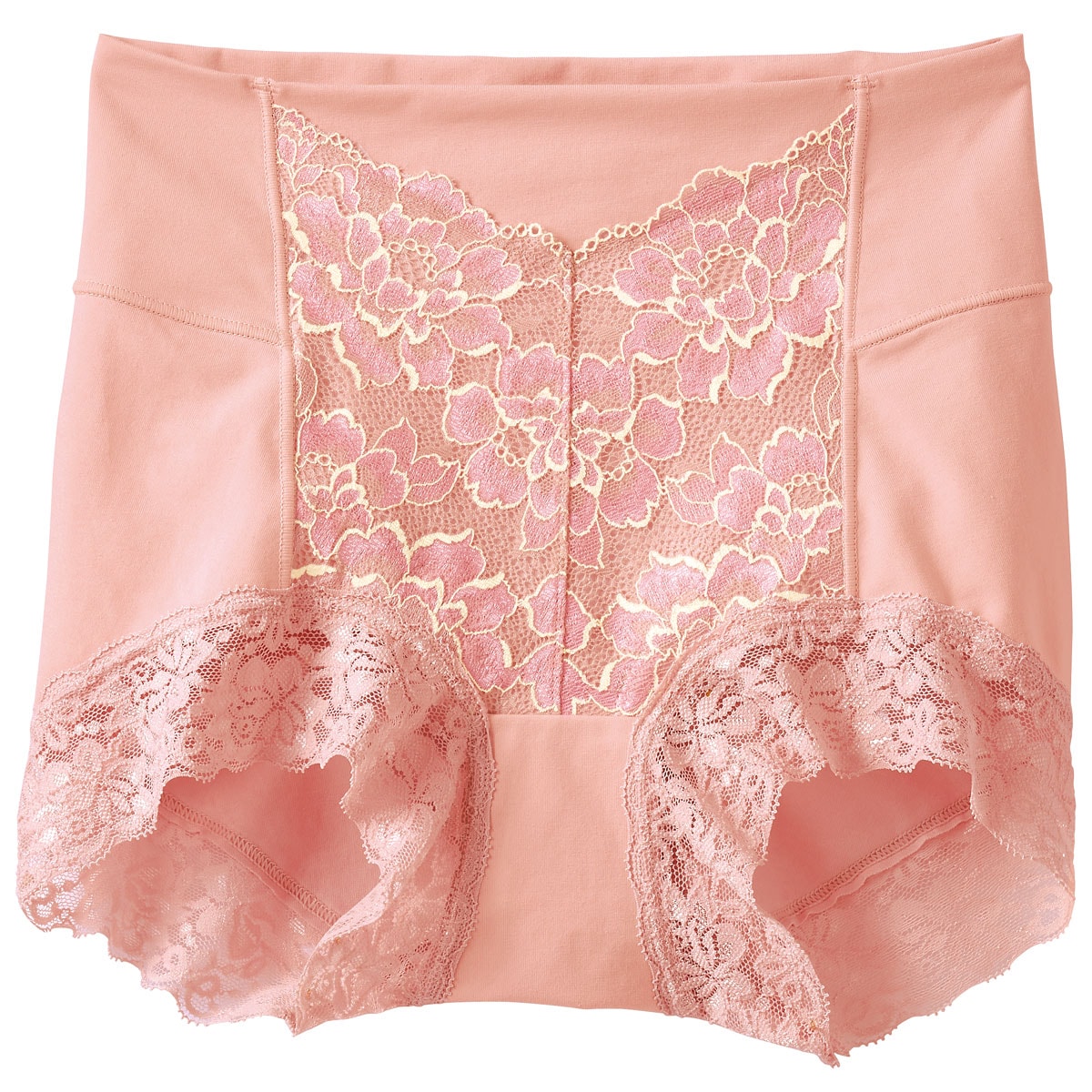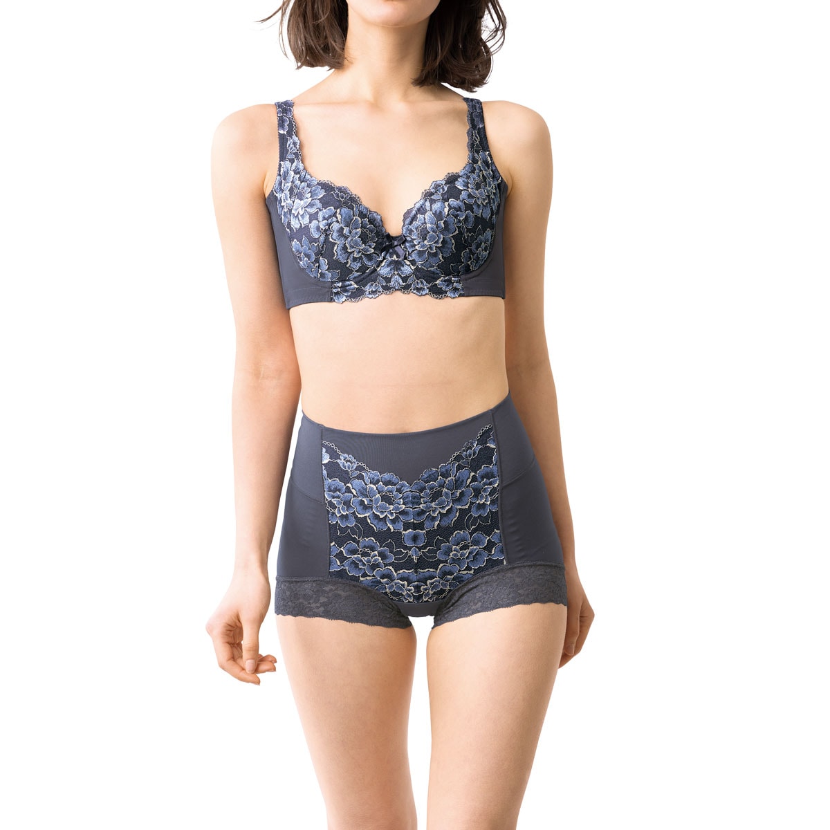 ポリウレタンを23%使用したハイパワーの綿混ストレッチ素材でガードルに近いホールド感。フロントは身生地2重+レースの3重で気になるお腹をおさえます。ウエストはゴムを使用しない身生地の折り返し、足口はやわらかなレース使いで不快なくい込みを軽減。お腹もヒップもすっぽり包み込む安心の着心地。ヒップは中心ギャザー入りで自然な丸みに整えます。人気の脇すっきりブラBA-425と同じレースデザインです。是非コーディネートでお試しください。