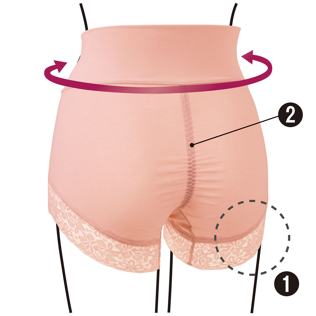(1)おなか押さえの3重構造 下腹からお腹中心は身生地2枚とレースで伸びを抑えた仕様。(2)ウエスト足口は快適に ウエストはゴムのない折り返しの仕様、足口はレース仕様。