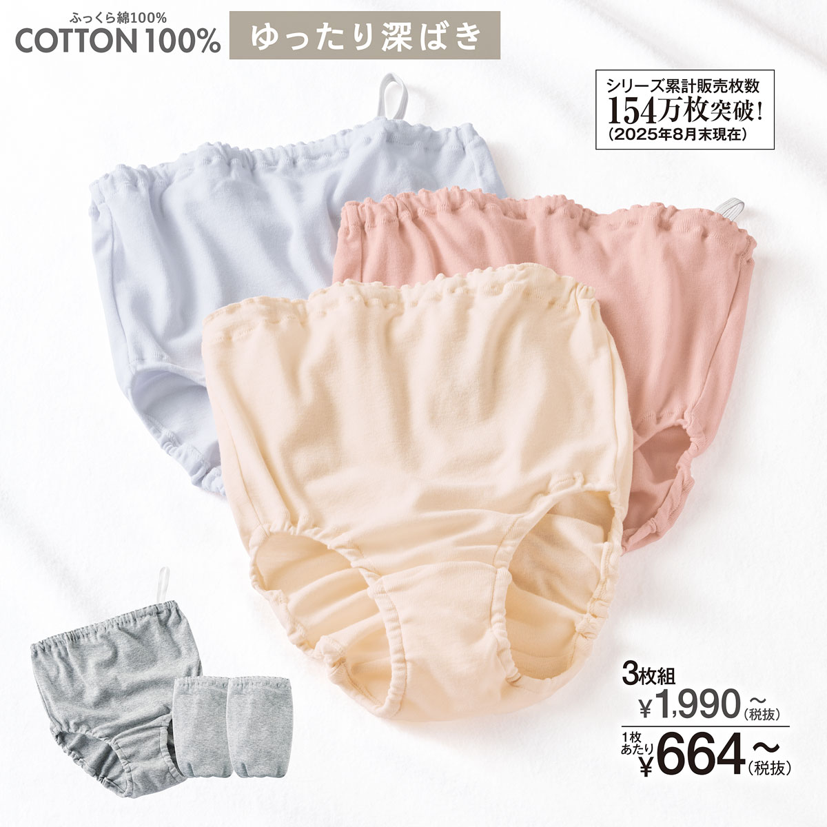 綿100%ショーツ・3枚組(前身頃長めでお腹すっぽり深ばき・くるみゴム)(はきこみ丈深め)