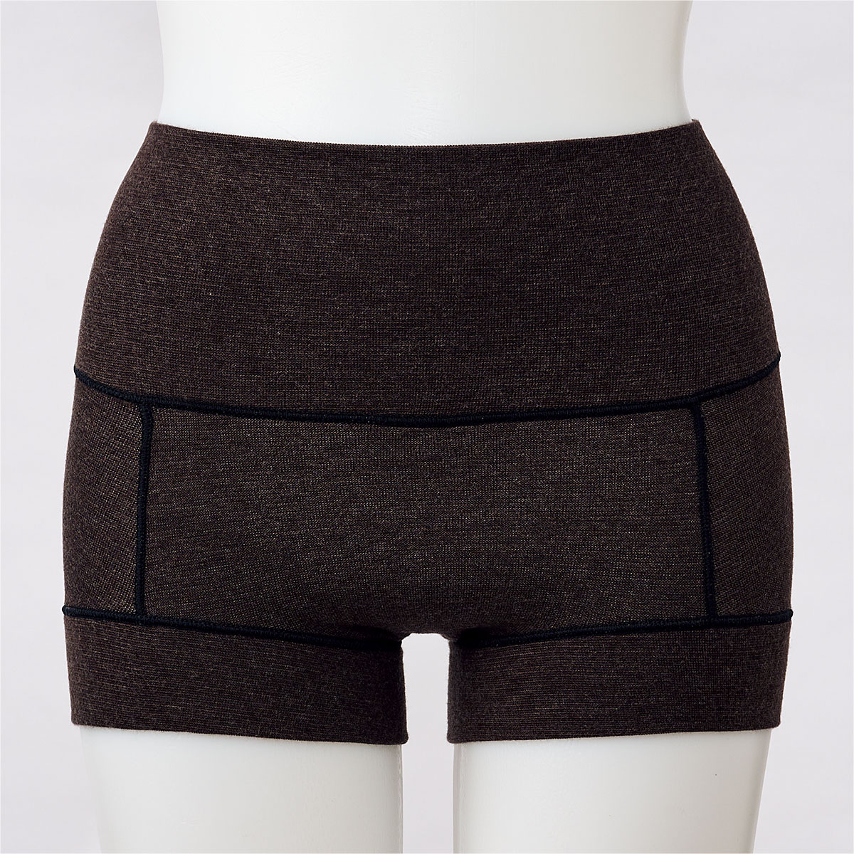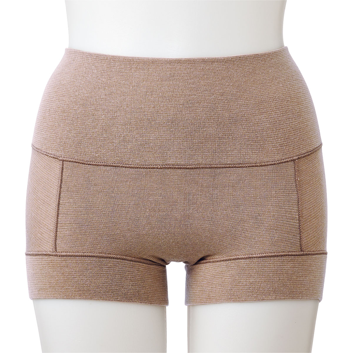 まるでカイロをはいているように、お腹まわりの冷えを防止するショーツ。保温性に優れたアクリルと、東洋紡の吸湿発熱繊維「エクス®」をボーダー状に編み上げたあたたか素材。チクチク感の少ないやさしい肌あたりで、ぐーんとよく伸びて窮屈感なくフィットします。はきこみ丈深めでお腹とお尻をすっぽり包み込む深履きタイプ。お腹から腰まわりは生地二重の折り返し仕様でさらにあたたかく。縫い目がゴロつきにくいフラット縫製。マチ裏は綿100%で快適。