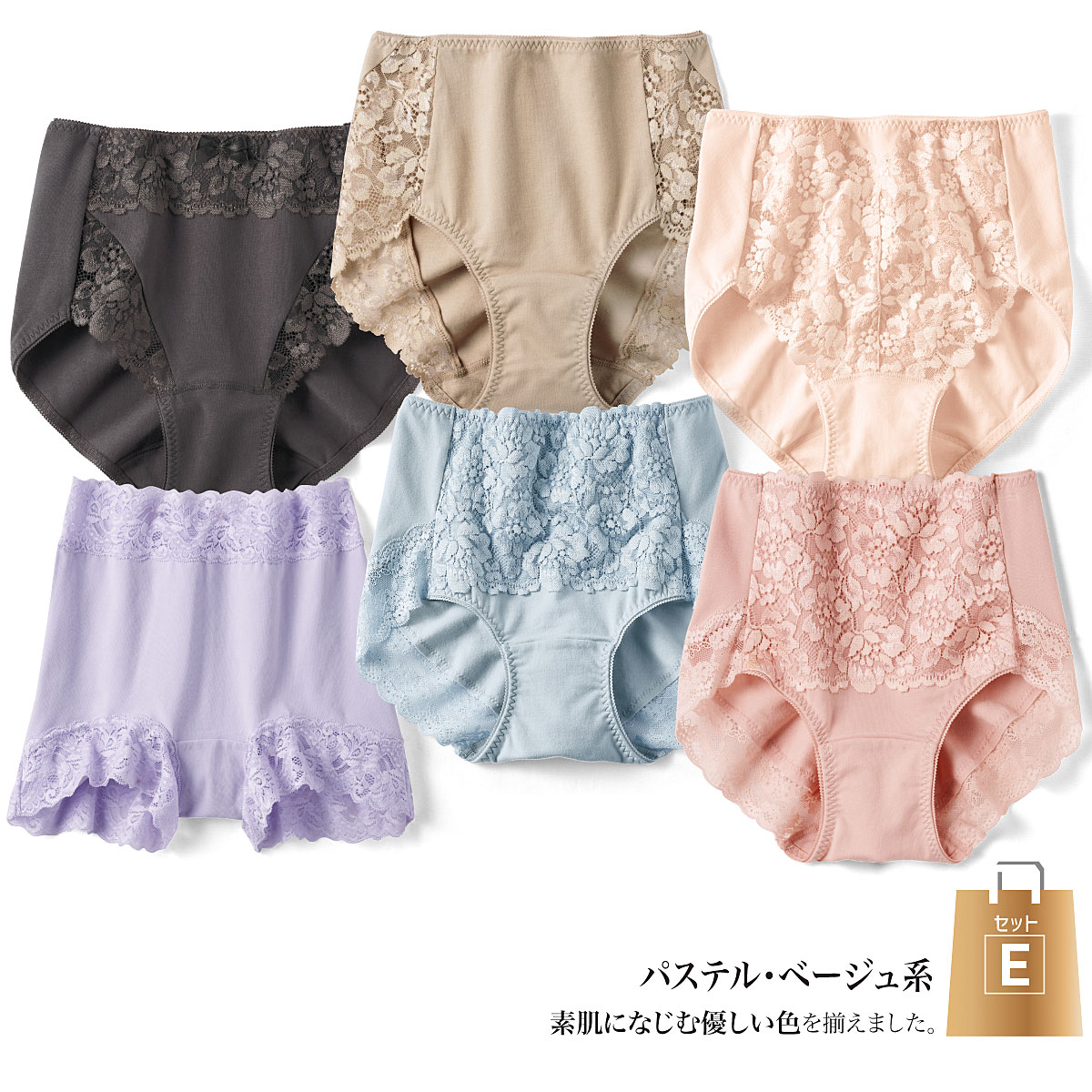 セシール人気のレーシーショーツ(品番EE-804)を多くのお客様に試していただきたい思いから、デザインに悩むお客様の声に、全5デザインお試しいただける6枚組セットを企画しました。ご愛用いただくお客様にも是非この機会に他のデザインも試してみてください。新年を華やかに迎えるお年賀ショーツにもお勧めです。「華やか系」「パステル・ベージュ系」「カジュアル系」お好きなカラー系統3種類からお選びいただけます。お買い得価格で通常価格より990円お値引きして、準備数2,000セットのご提供です。5Lの大きいサイズまで揃っています。