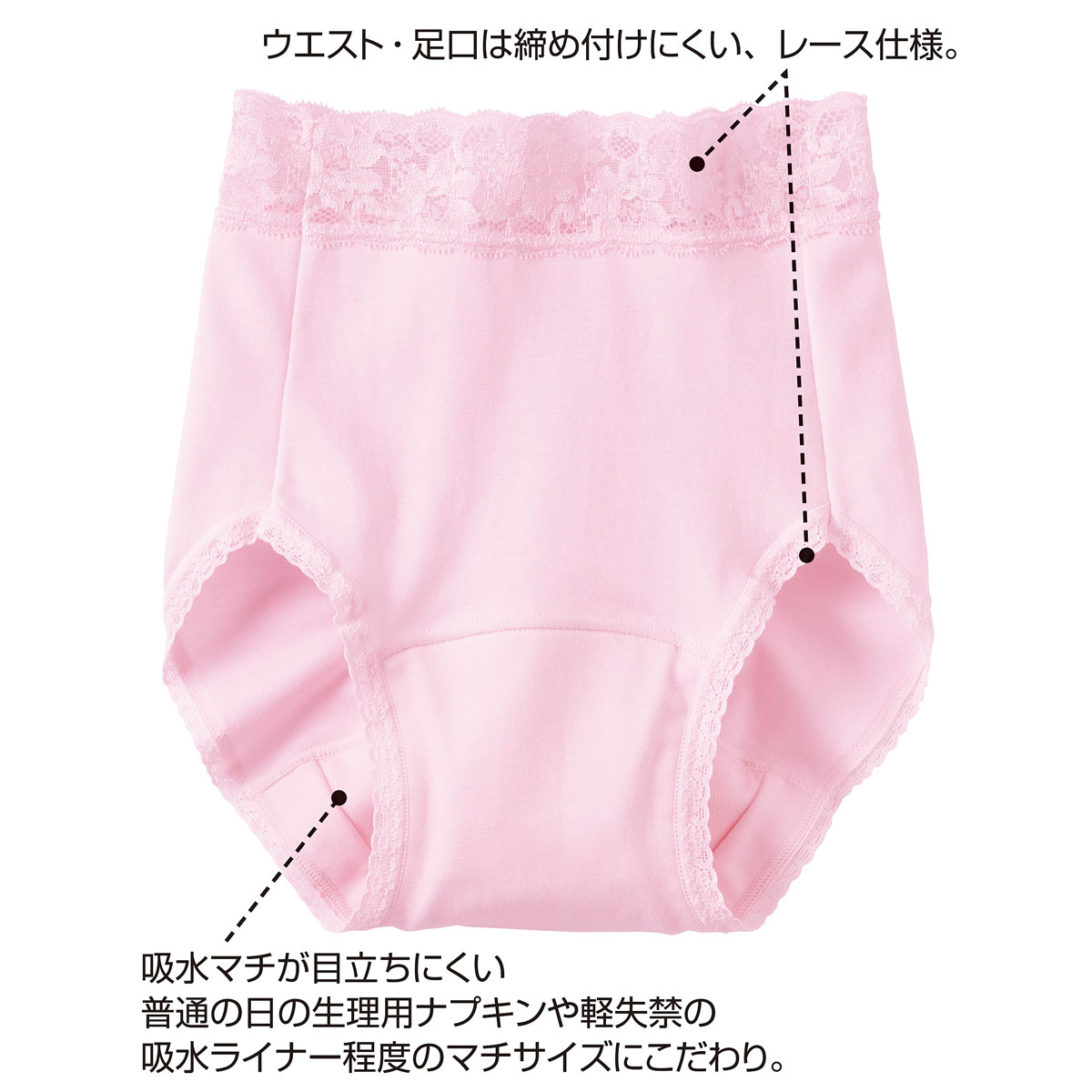 ▼表示吸水量は、商品を平面に置き人工尿を滴下した試験での総吸水量です。1度に吸収する量ではありません。<ご使用上の注意>・この商品は、おむつではありません。濡れた場合は早めの交換をお願いします。また、ご使用時の行動・動作により漏れ出すことがありますのでご注意ください。・マチの吸水布は、素材の特性上乾きにくいため十分に脱水したあと、裏返して干してください。雨天時や冬場の乾きにくい時期は、扇風機やエアコンなどで十分乾燥させることをお勧めします。■身生地=綿80%ナイロン18%ポリウレタン2%(ストレッチ片袋)レース=ナイロン・ポリウレタン(ストレッチレース)●吸水布は抗菌防臭●パッド肌側はポリエステル素材●日本製【綿混ストレッチ】(身生地)【吸水量(目安)~15cc】 【フィット指数】★★☆☆☆(ゆったり)【大きいサイズも展開】(M~5L)