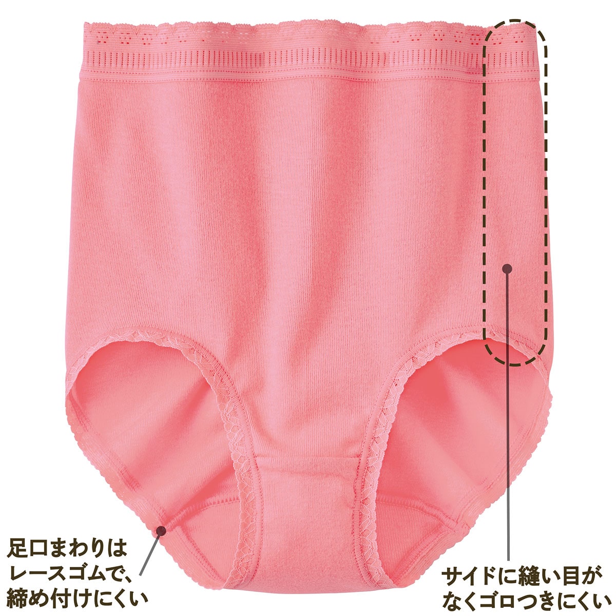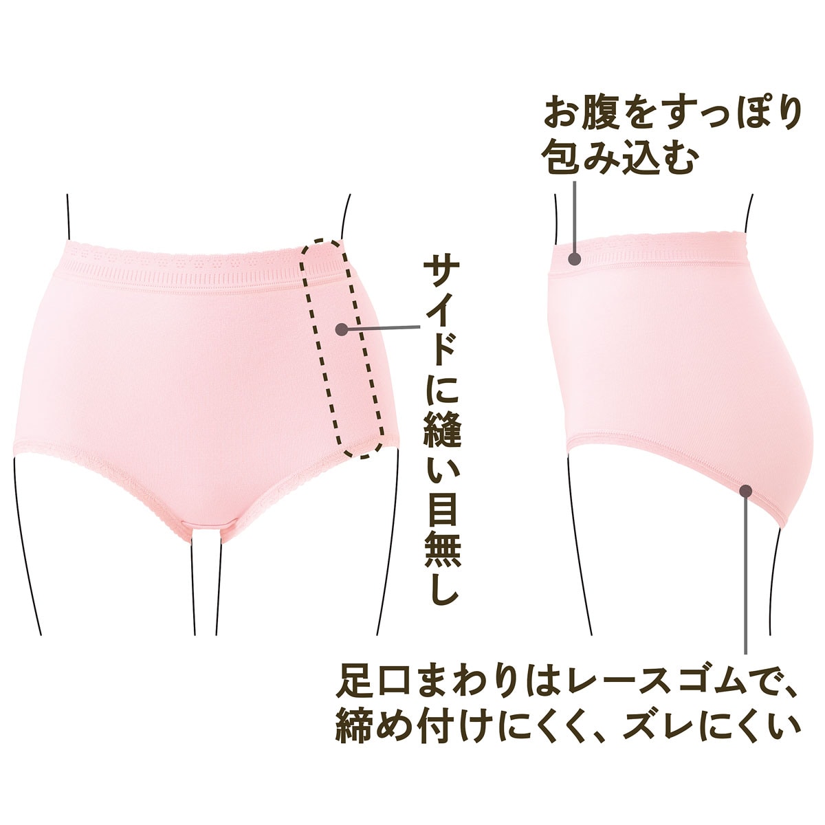 サイドに縫い目がなくゴロつきにくい足口まわりはレースゴムで、締め付けにくい