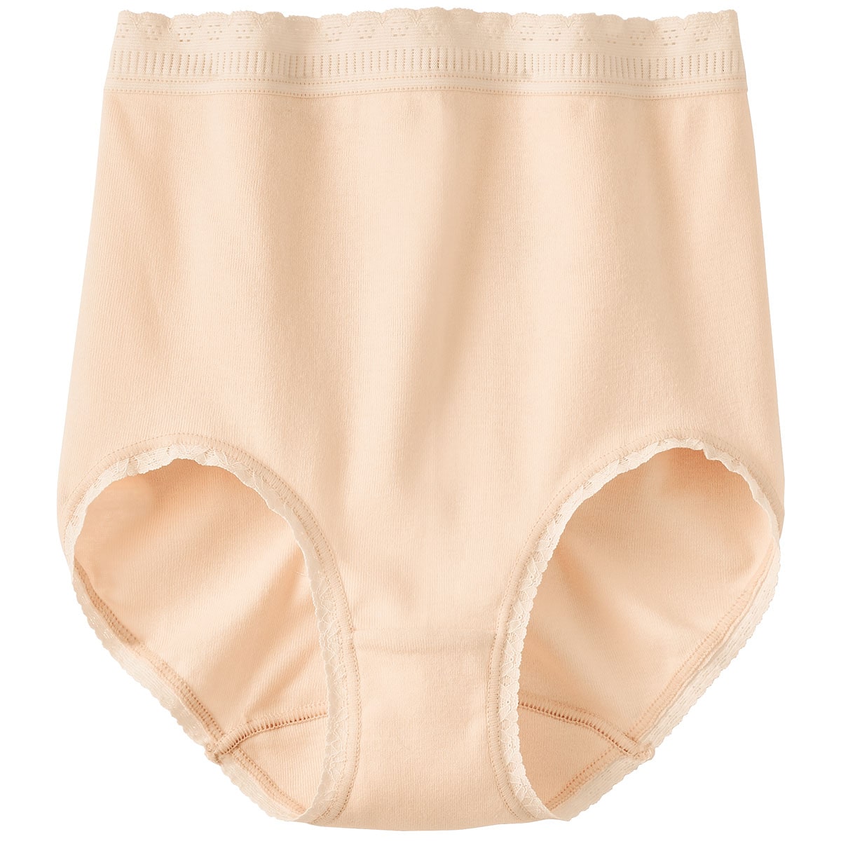 ■身生地=綿97%ポリウレタン3%(ストレッチ性フライス)レース=ナイロン・ポリウレタン(ストレッチレース)●サイドシームレス(脇に縫い目がないからゴロつきません)▼洗濯表示は身生地にプリント●マチ裏は綿素材●中国製【綿混ストレッチ】(身生地)【フィット指数】★★★☆☆(ぴったり)【大きいサイズも展開】(M~5L)