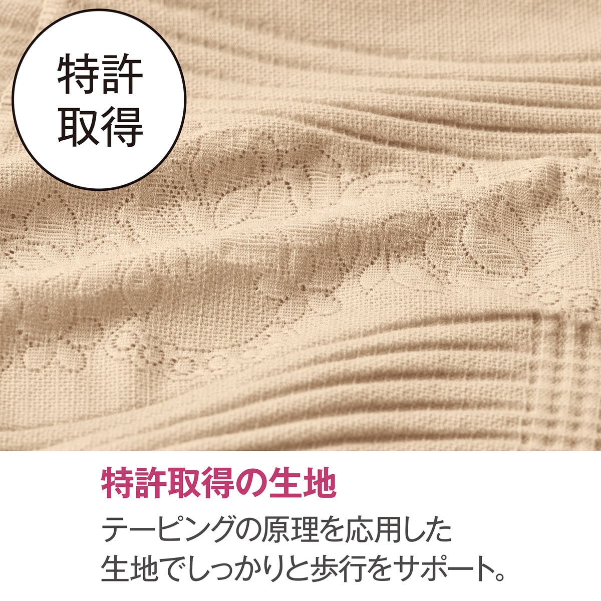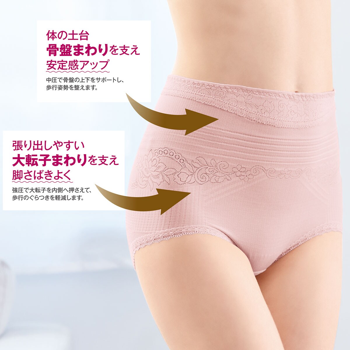 ピンク (1)体の土台骨盤まわりを支え安定感アップ 中圧で骨盤まわりの上下をサポートし、歩行姿勢を整えます。(2)ウエストはゴム不使用の折り返し仕様。(3)足口はレース使いで響きにくい。(4)張り出しやすい大転子まわりを支え脚さばきよく 強圧で大転子を内側へ押さえて、歩行のぐらつきを軽減します。(5)脇に縫い目がなく、ゴロつきにくい。