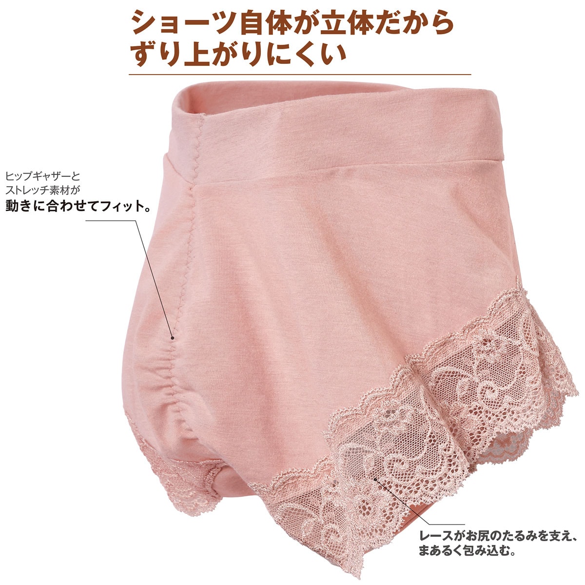 歩いたり動いたりするたびにショーツのくい込みやずり上がりを直している、そんな人におすすめの快適ショーツ。独自のバック設計でお肉をホールドしながらずり上がりを防止。バックギャザーでお尻の丸みをつぶさずきれいなヒップラインをキープします。足口のストレッチレース仕様はアウターにひびきにくいだけでなく、たるみを支えるように設計しています。ウエスト・足口はゴム不使用で締め付けにくい。吸汗・速乾素材を使っているからムレにくく、1日中快適なはき心地です。
