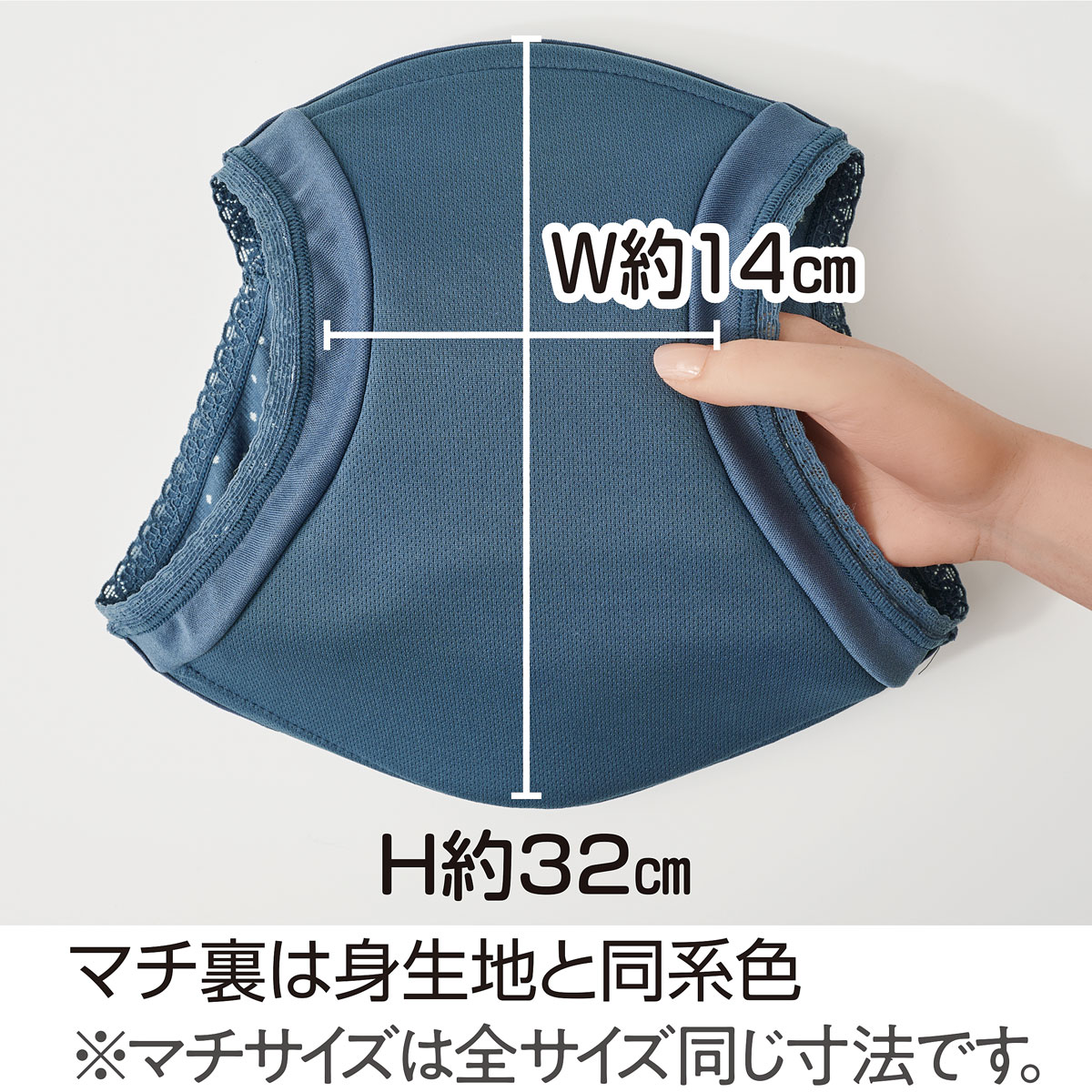 マチ肌側は、肌あたりやわらかで、濡れ戻りしにくいメッシュ素材を使用
