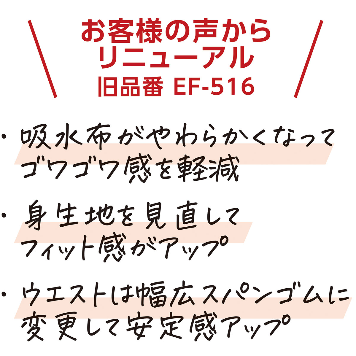 横もれ防止機能とパッド部分を後ろに大きく広げた設計で安心の吸水量。旧品番EF-516から、吸水布が柔らかくなりゴワゴワ感を軽減しました。消臭加工(アンモニア臭)の吸水布で、ニオイの心配も軽減!身生地は綿たっぷりのやや厚手素材で心地よくフィット。ウエストは幅広スパンゴムで締め付けにくく、安定。安心品質の日本製です。