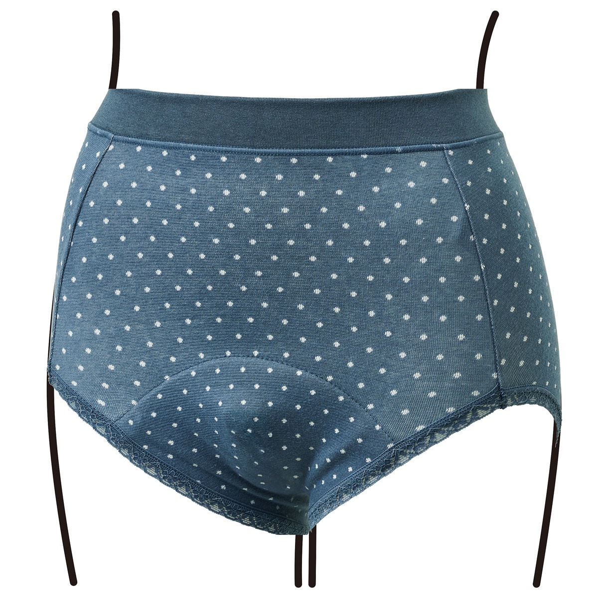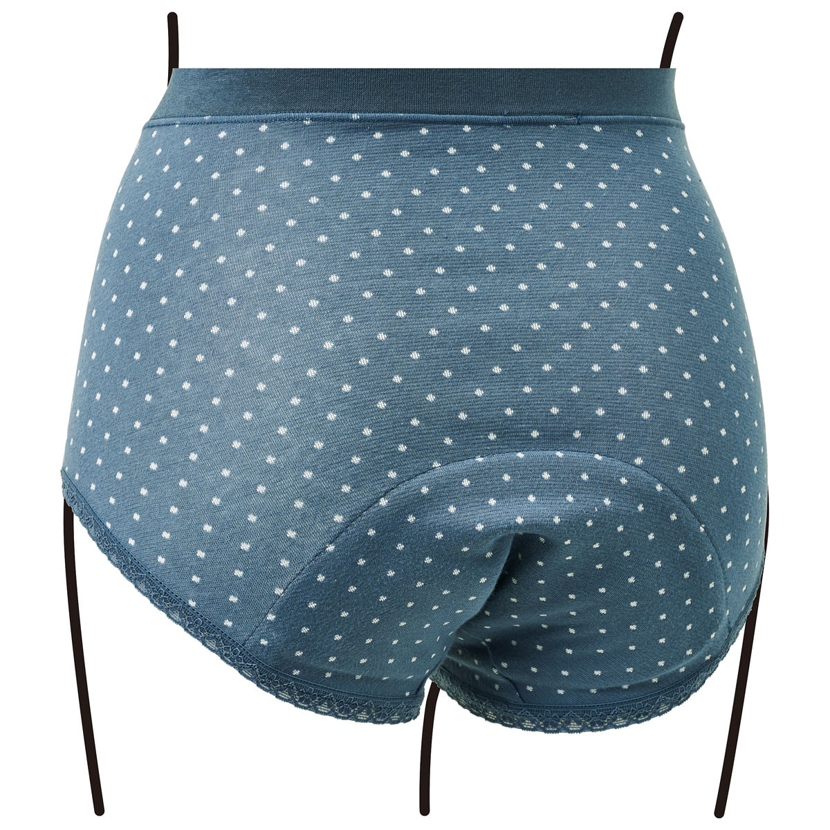 ブルー (1)幅広スパンゴムで締め付けにくく、安定。(2)綿たっぷり、やや厚手素材ジャカードのドット柄。(3)足口は締め付けにくいレース仕様。
