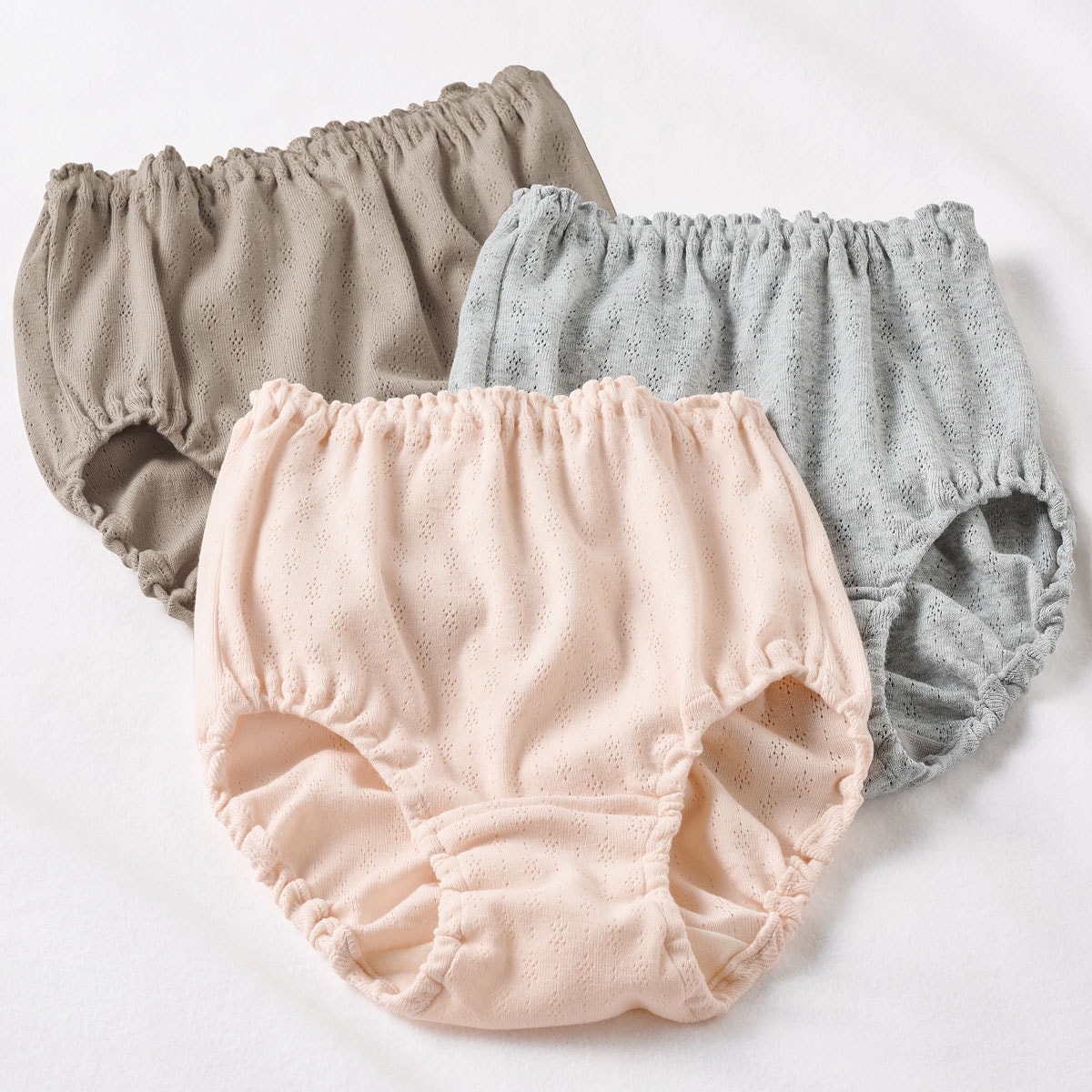 安心深ばきショーツ・色違い3枚組(綿100%・はきこみ丈深め・くるみゴム・ふんわりメッシュ)