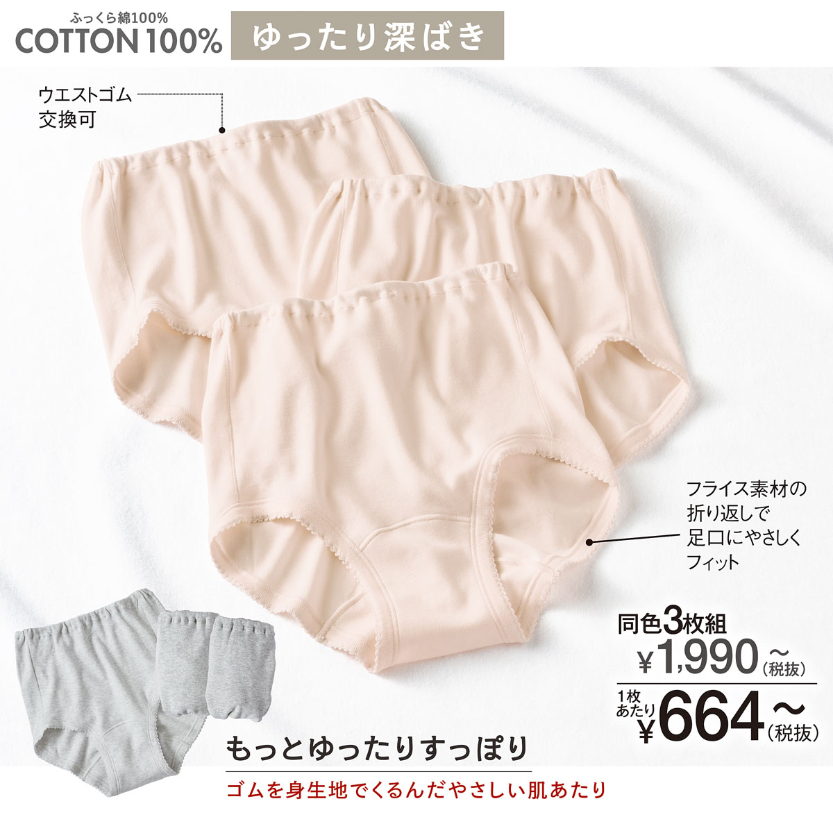 シェルピンク 同色3枚組(1)ウエストゴム交換可(2)フライス素材の折り返しで足口にやさしくフィット