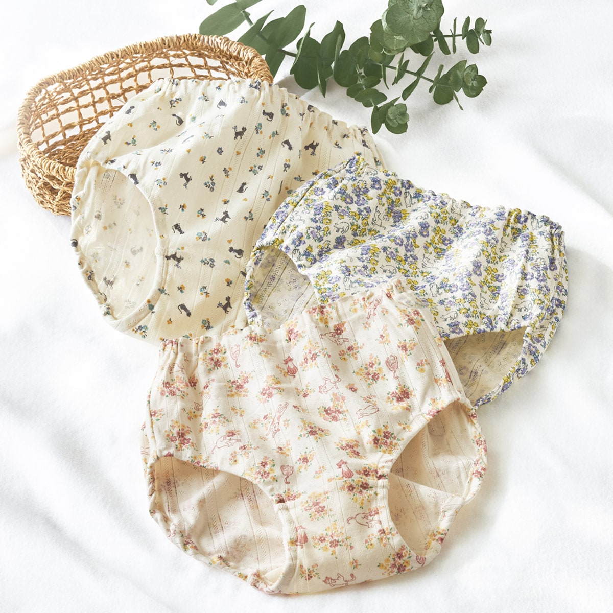 ネコモチーフの柄違い3枚組ショーツ♪肌にやさしい綿100%!すっぽり包み込む深めのはき込み丈で安心感のあるはき心地。