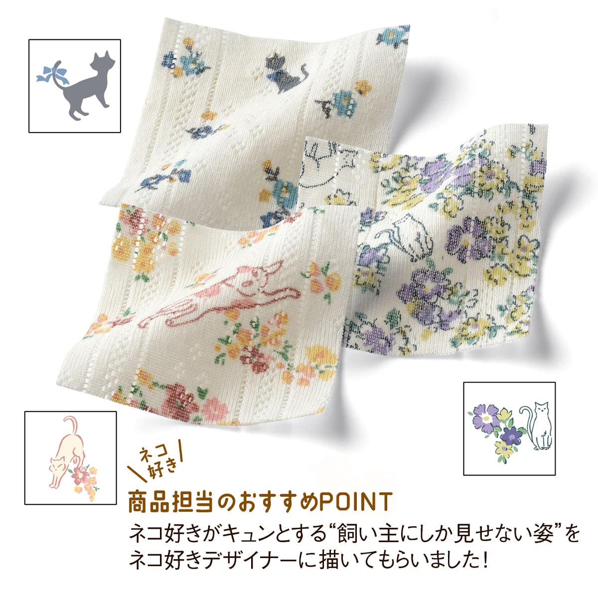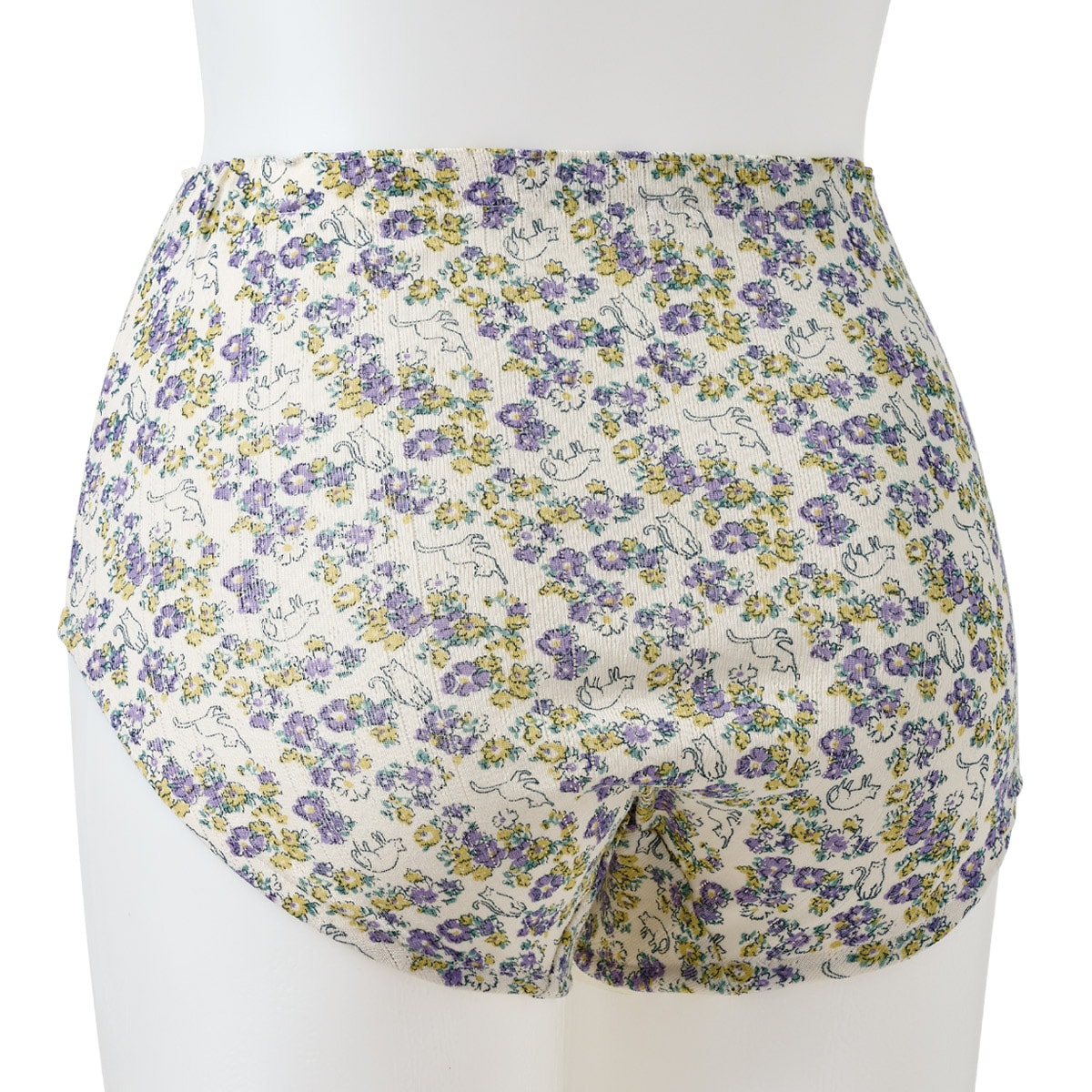 素肌にやわらかい綿100%パターンメッシュ素材のデイリーショーツ。ヒップをすっぽり包み込むはきこみ丈深めタイプ。ウエストと足口はゴムが肌に当たらないよう身生地でくるみました。ネコ好きのデザイナーが提案する、ネコモチーフの3柄セットをお届けします。