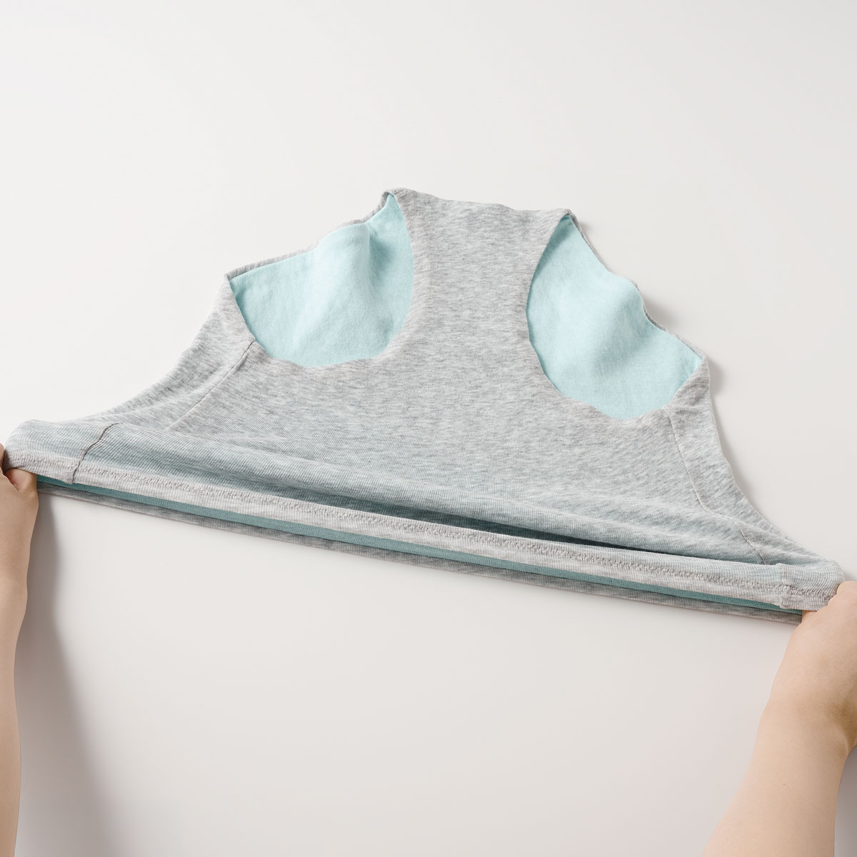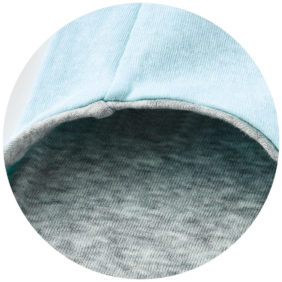 ベビー肌着のようなガーゼ調接結フライス(肌側) ふんわりとやわらかな風合いで素肌への負担を最小限に。表側も綿100%の二重仕立て素材です。