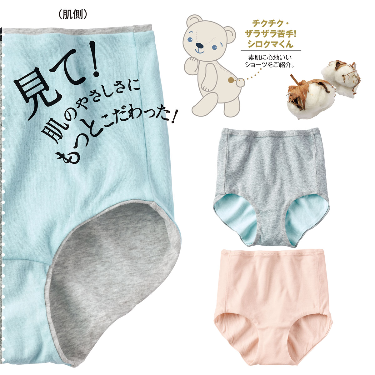 敏感肌さんにもお勧め、素肌がよろこぶはき心地。綿100%で肌側に縫い目があたりにくい2重仕立てのショーツ。お客様の声から、ゴムがやわらかくなってリニューアル!